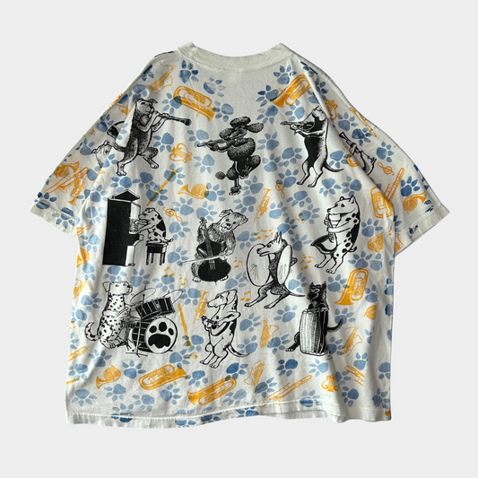 90's "JAZZ DOGS NEW ORLEANS" Tシャツ 総柄 ホワイト (XL)/A7558T-SO