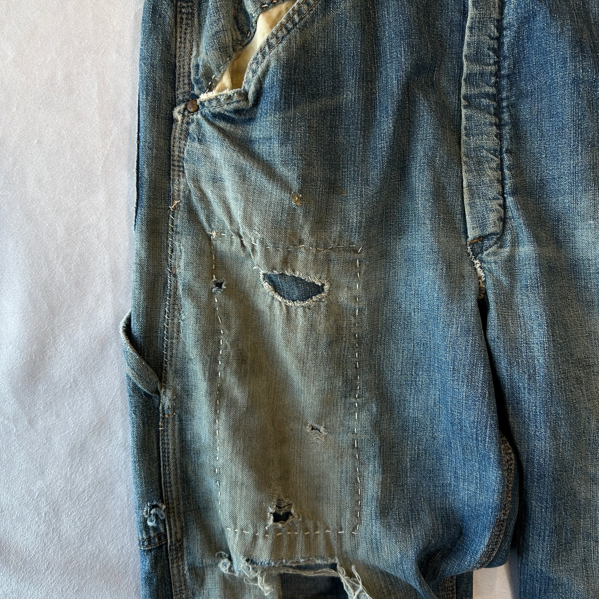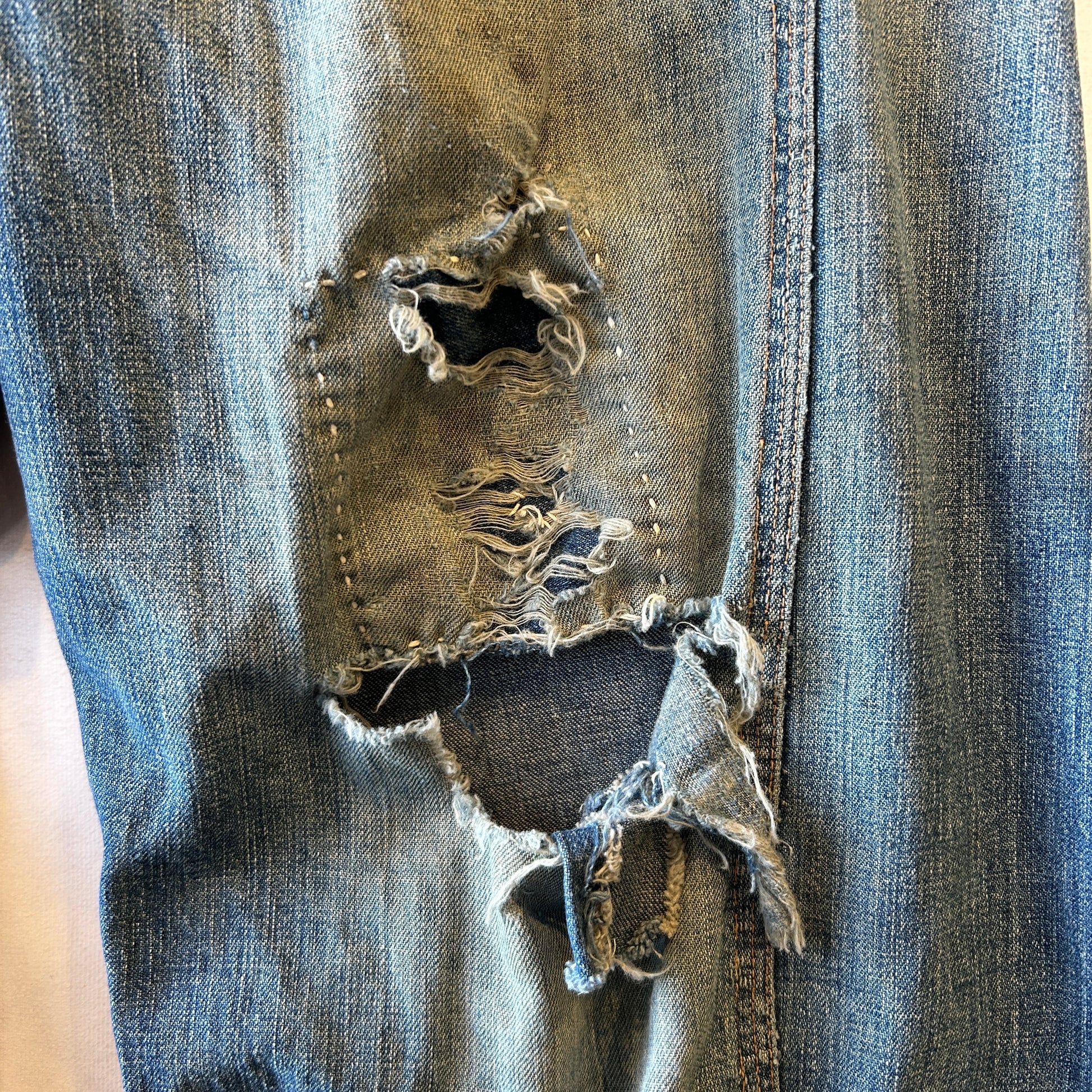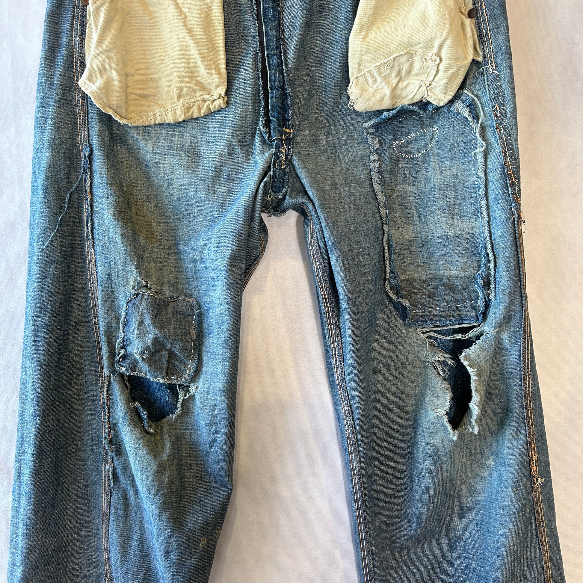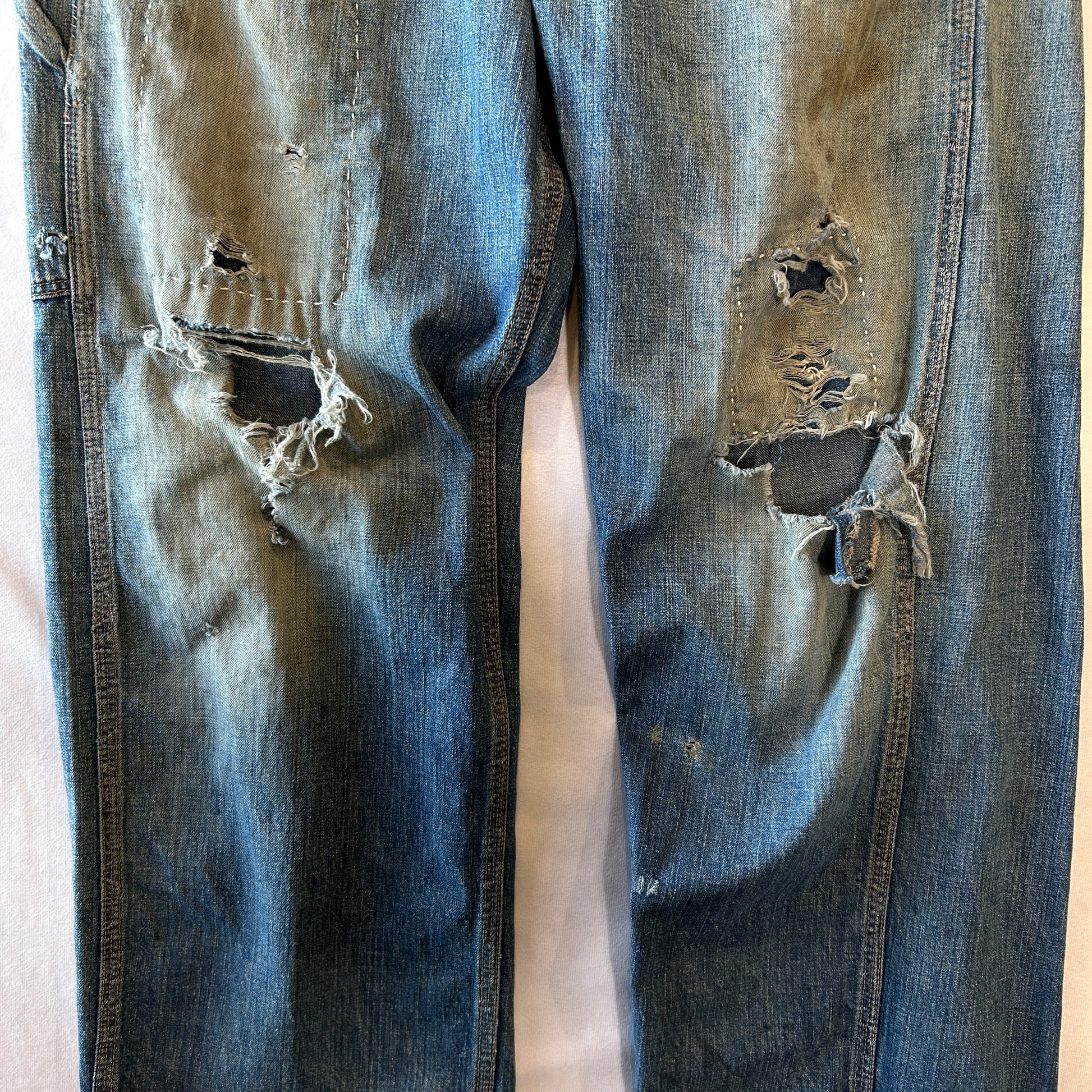[状態特記]全体的に使用感あり、前面にダメージとリペア有り、両膝部分大きく穴開き有り、裾にダメージあり、股部分に補修あり、右ポケットに穴開きあり、背面ポケット縁に補修や解れあり