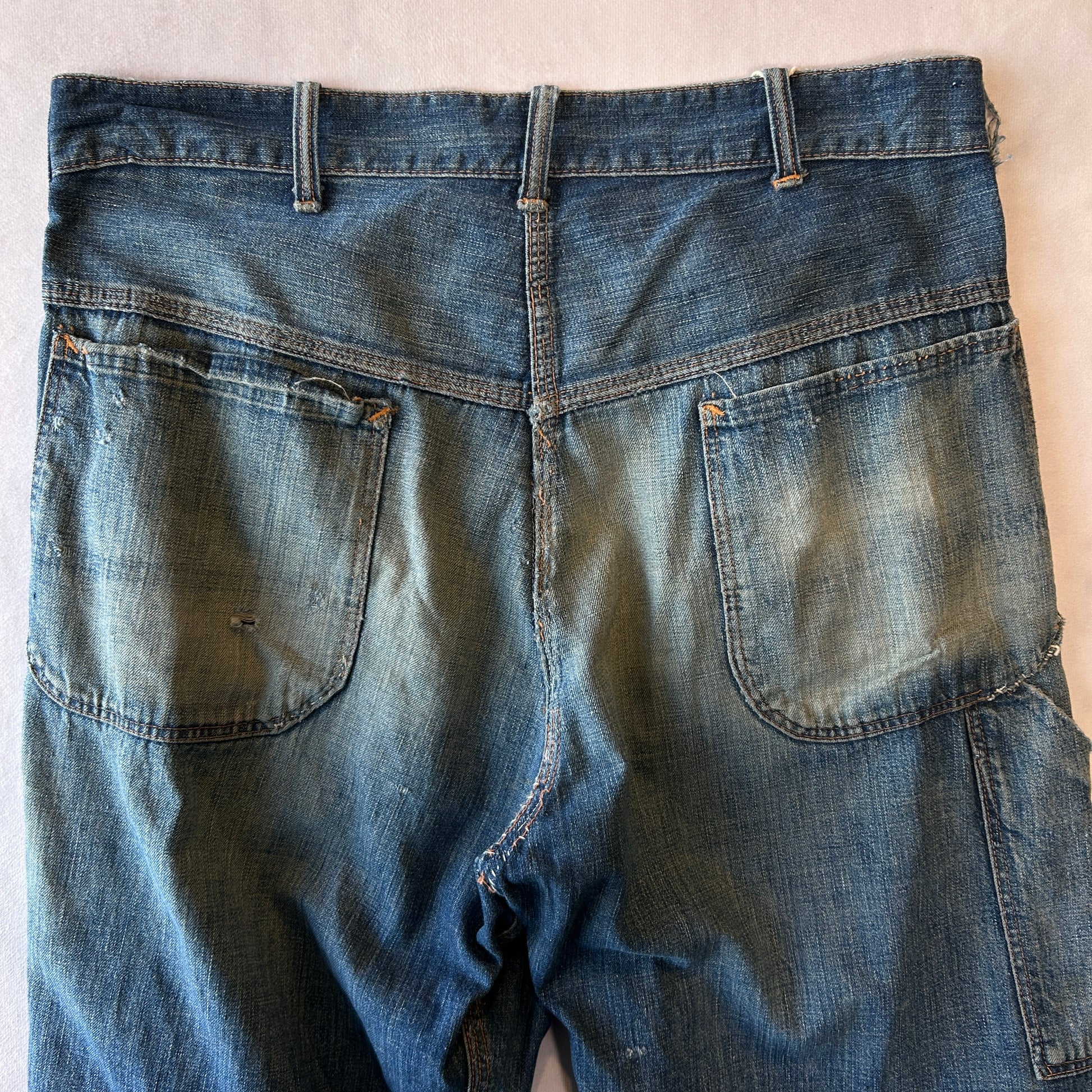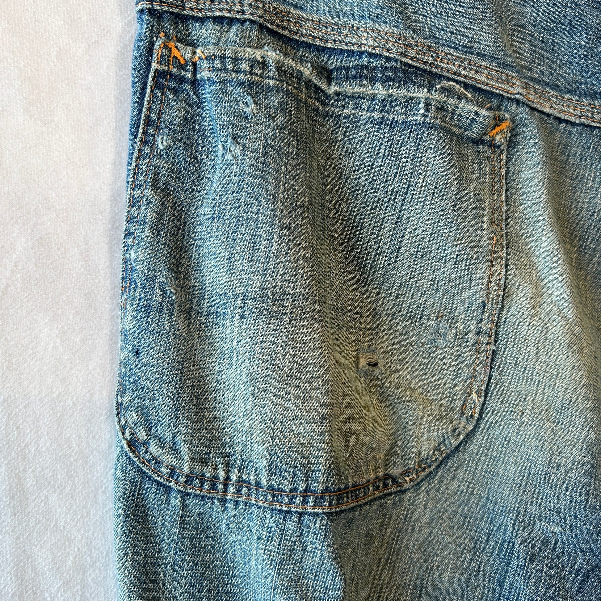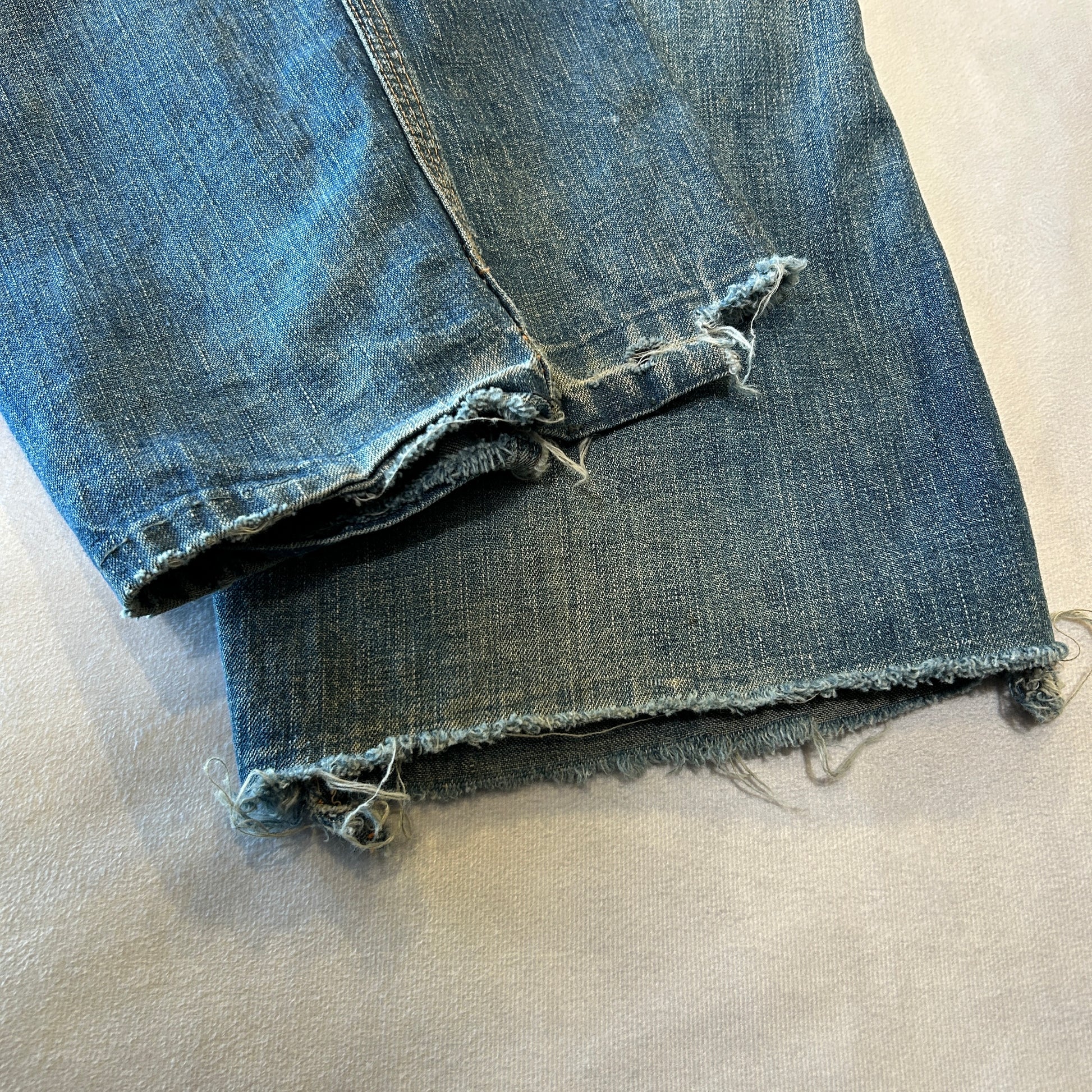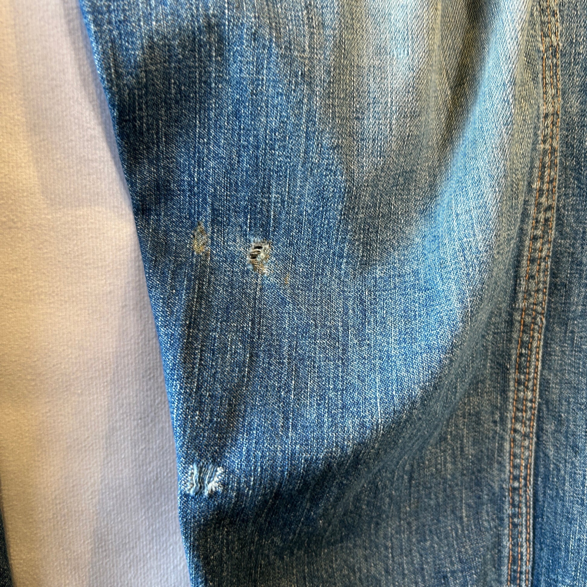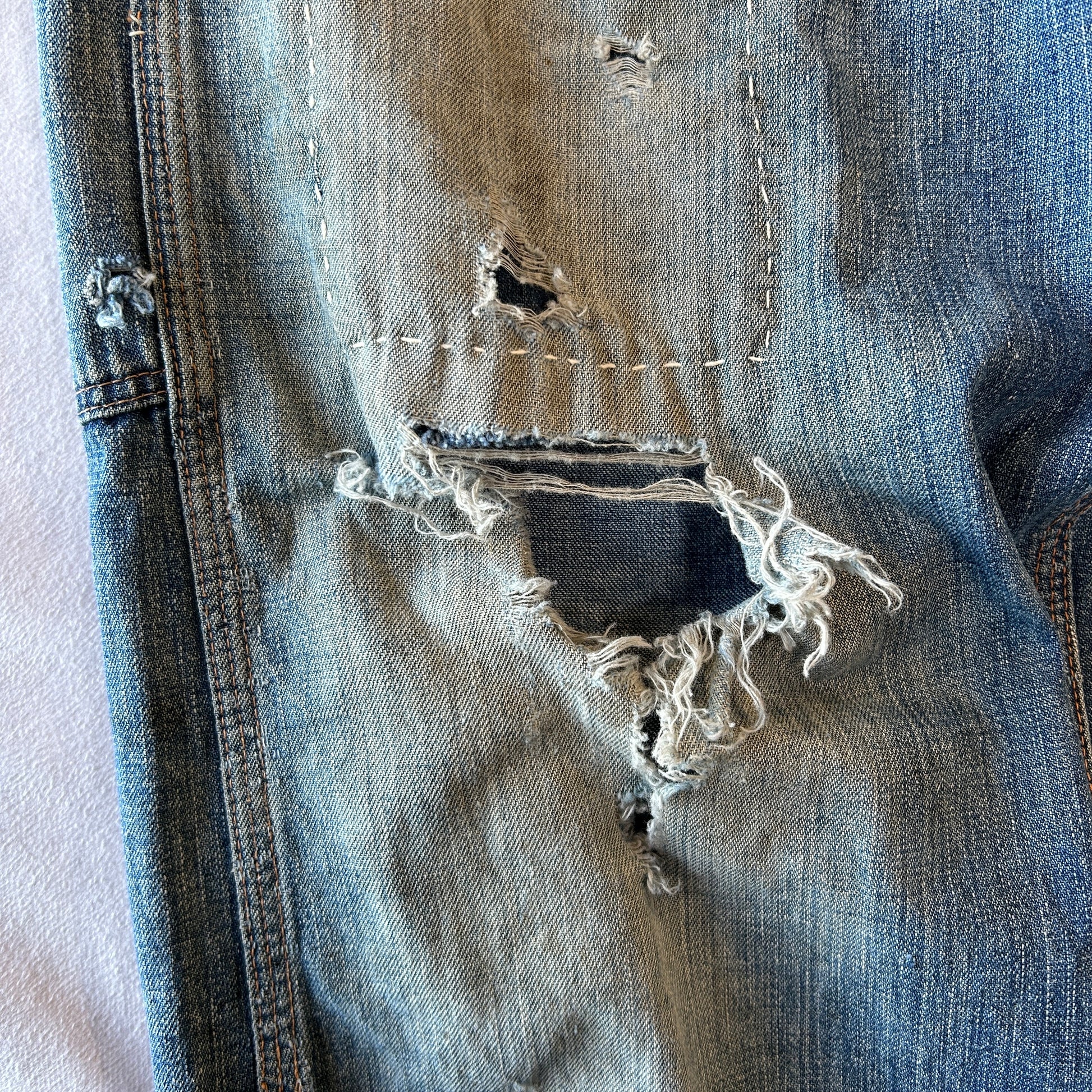 [状態特記]全体的に使用感あり、前面にダメージとリペア有り、両膝部分大きく穴開き有り、裾にダメージあり、股部分に補修あり、右ポケットに穴開きあり、背面ポケット縁に補修や解れあり