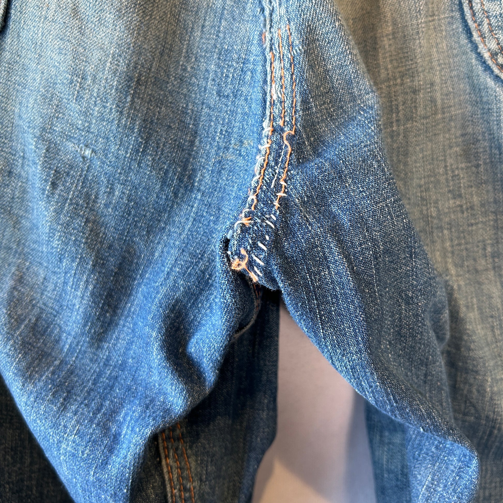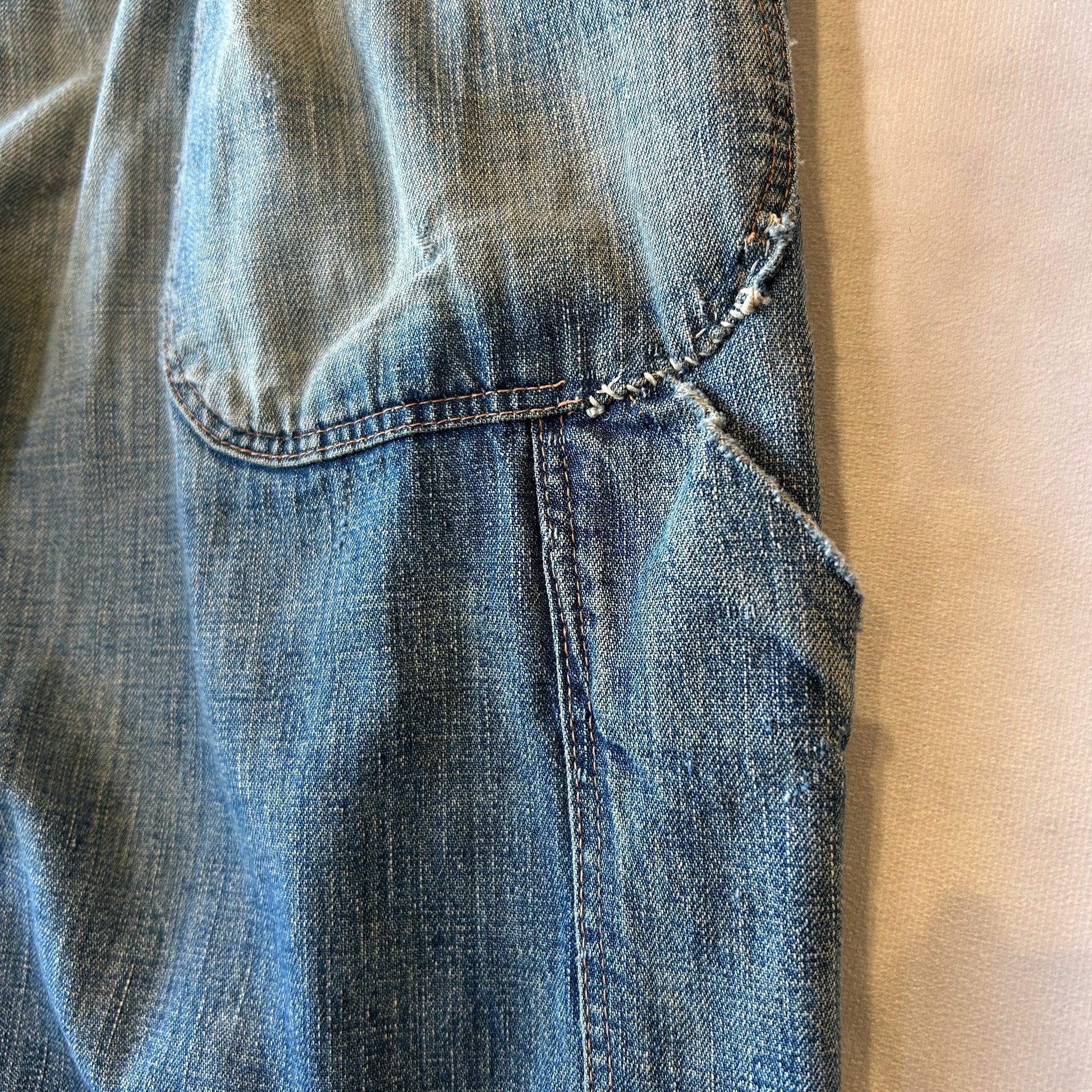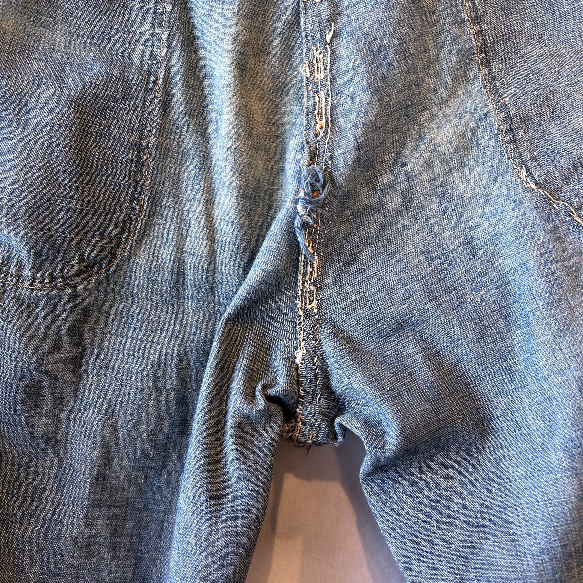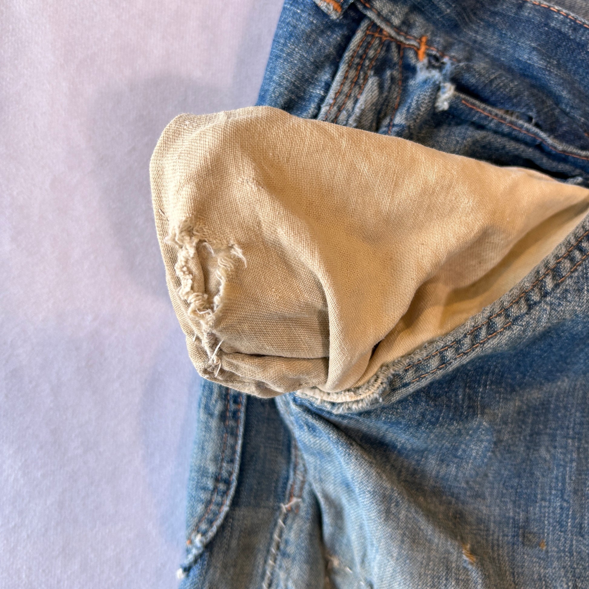 [状態特記]全体的に使用感あり、前面にダメージとリペア有り、両膝部分大きく穴開き有り、裾にダメージあり、股部分に補修あり、右ポケットに穴開きあり、背面ポケット縁に補修や解れあり