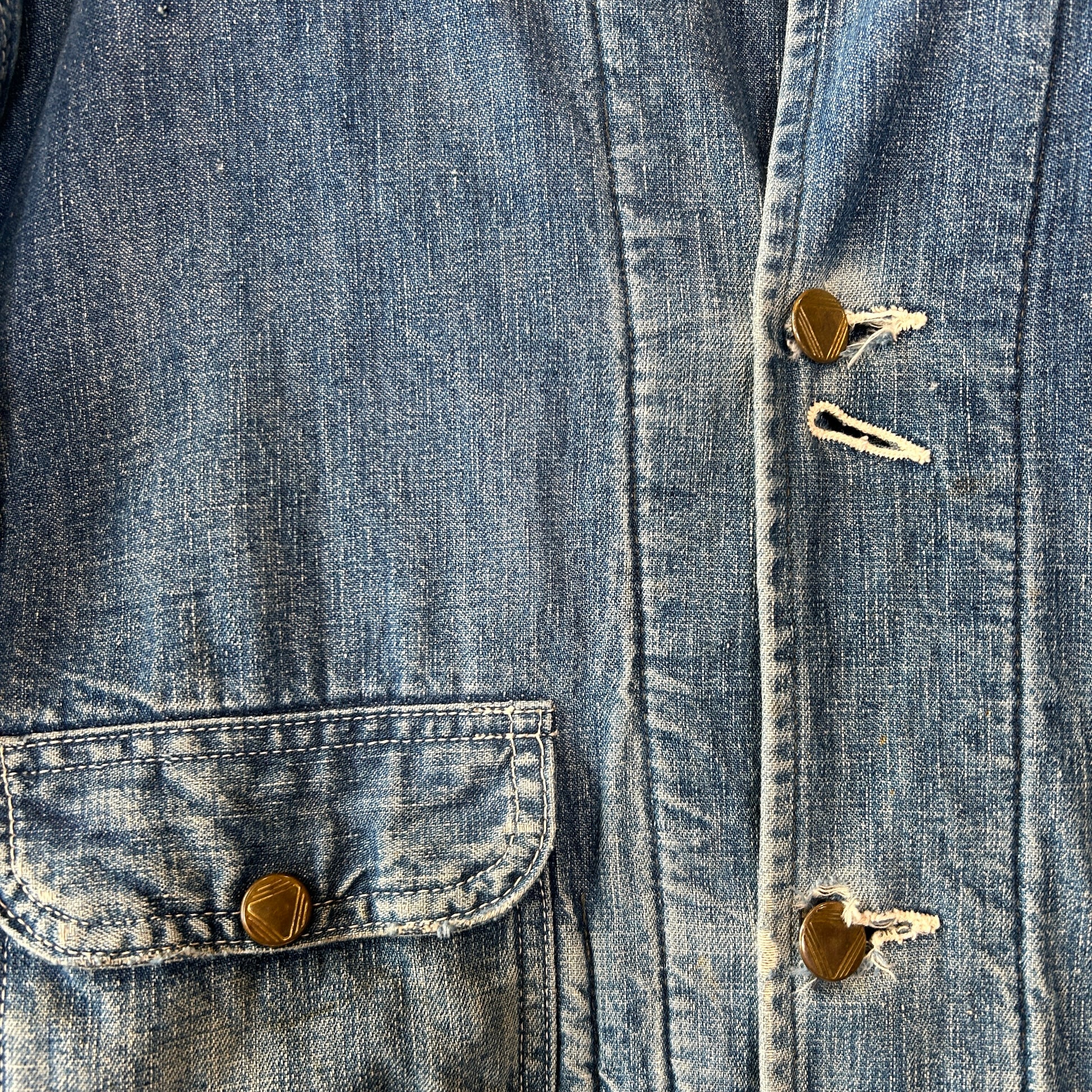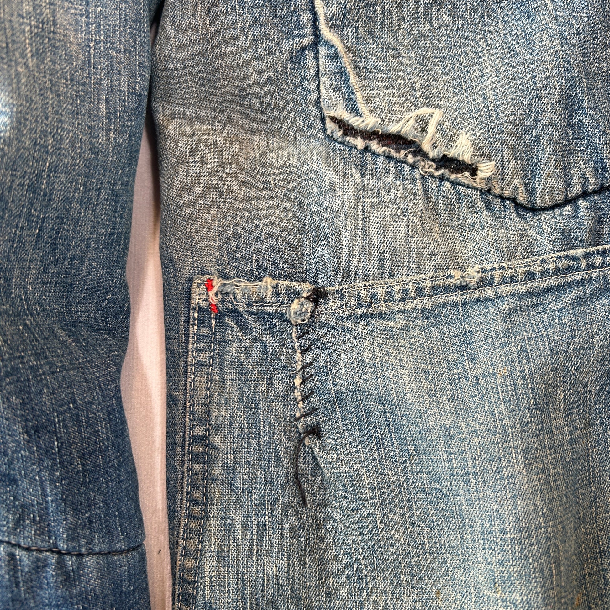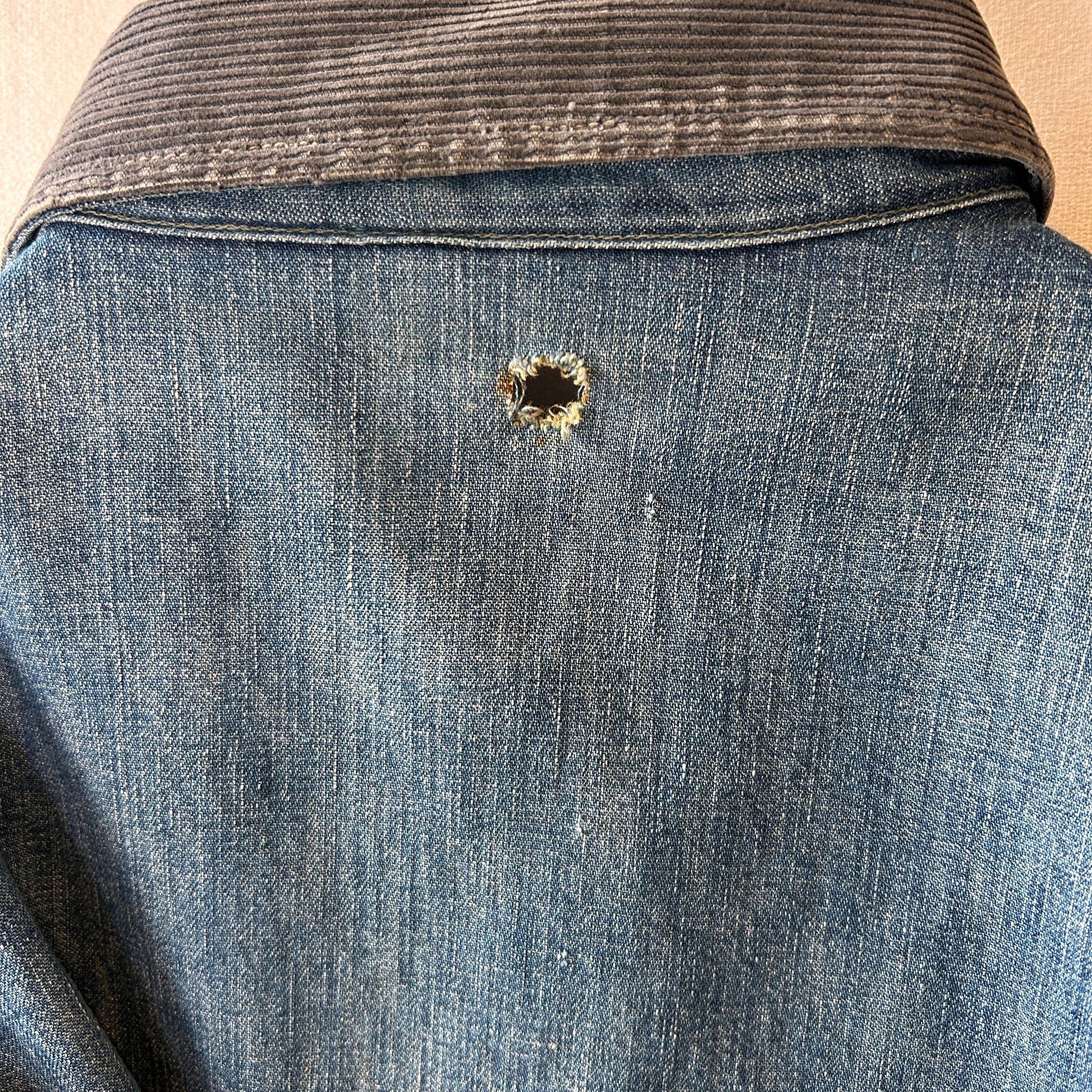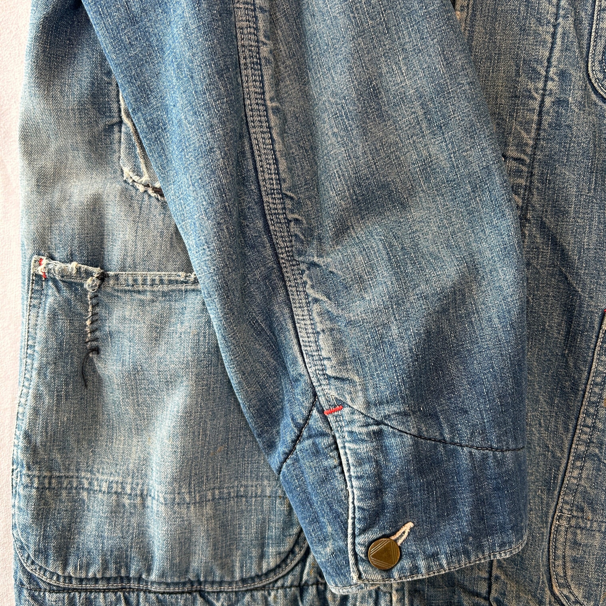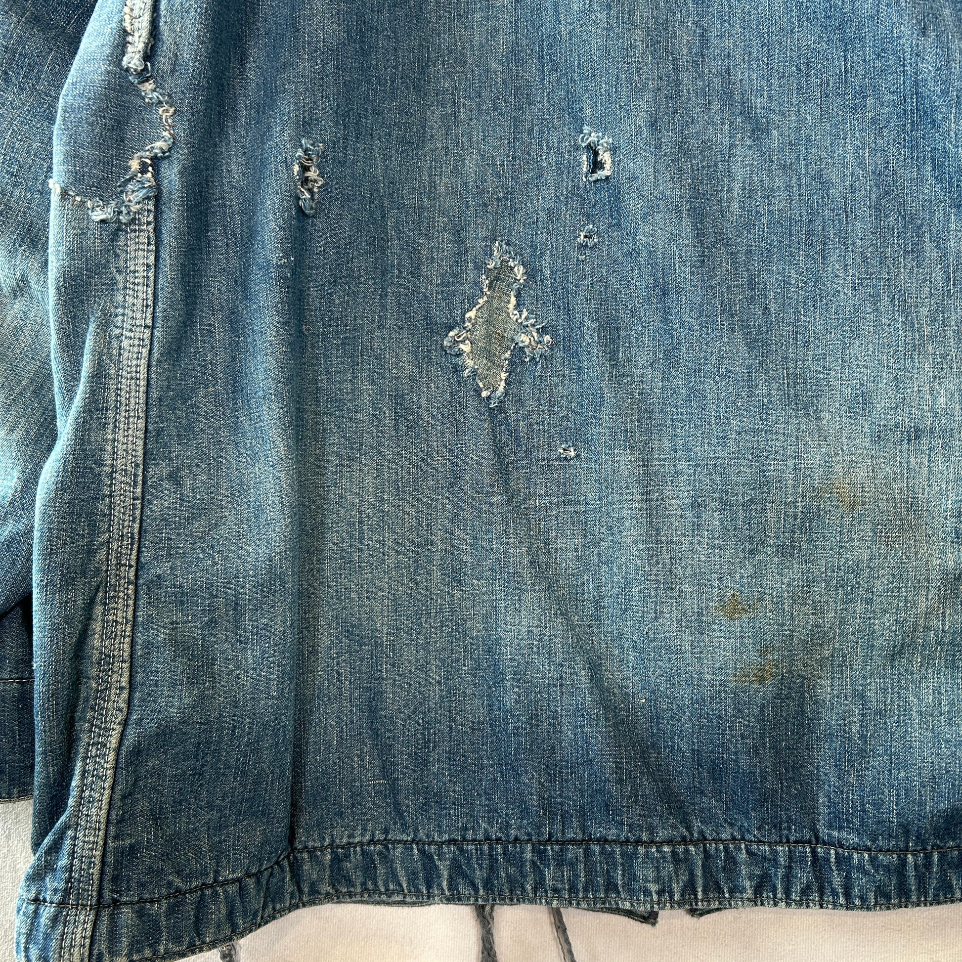 [状態特記]全体的に使用感あり、裏地ダメージ有り、襟内側に擦れ・ダメージ有り、右ポケット・胸ポケ下部にダメージ、左脇にリペアあり、フロントボタンホールにダメージ有り(上から2,3,4ボタン)、左ポケット底に穴開き有り、背面襟下・下部にダメージ有り、フロント第二ボタン部の生地にダメージ有り、その他画像参照ください。