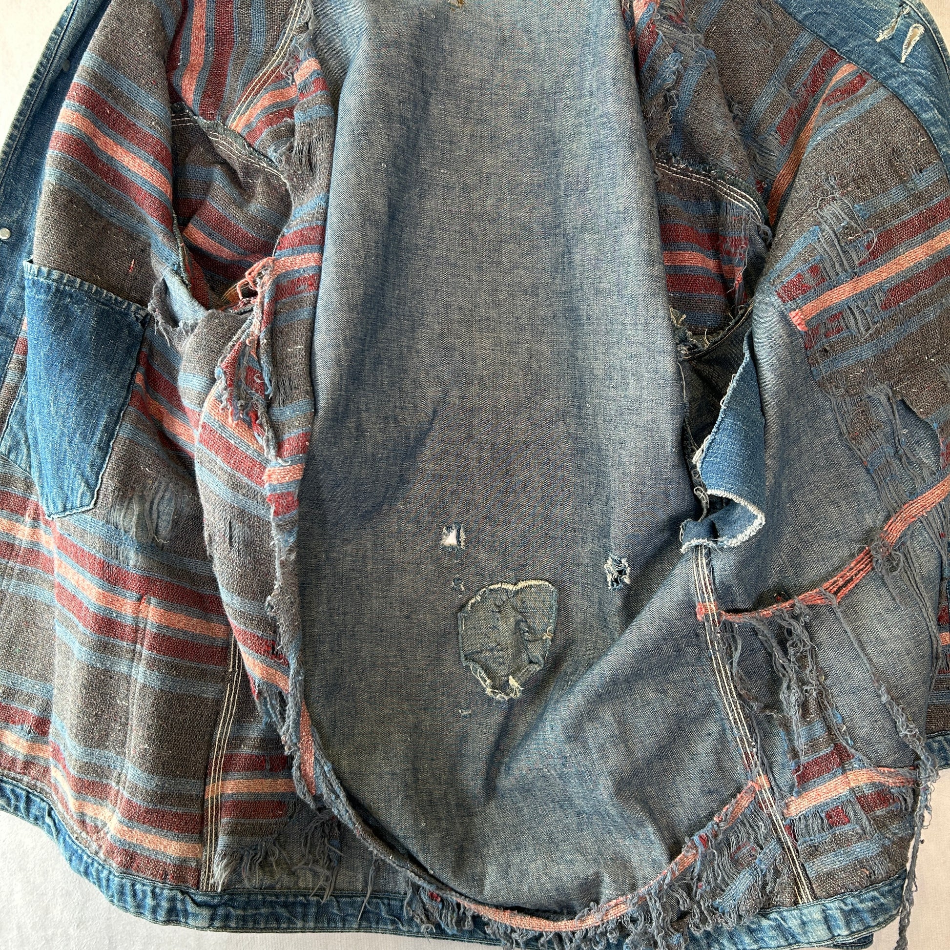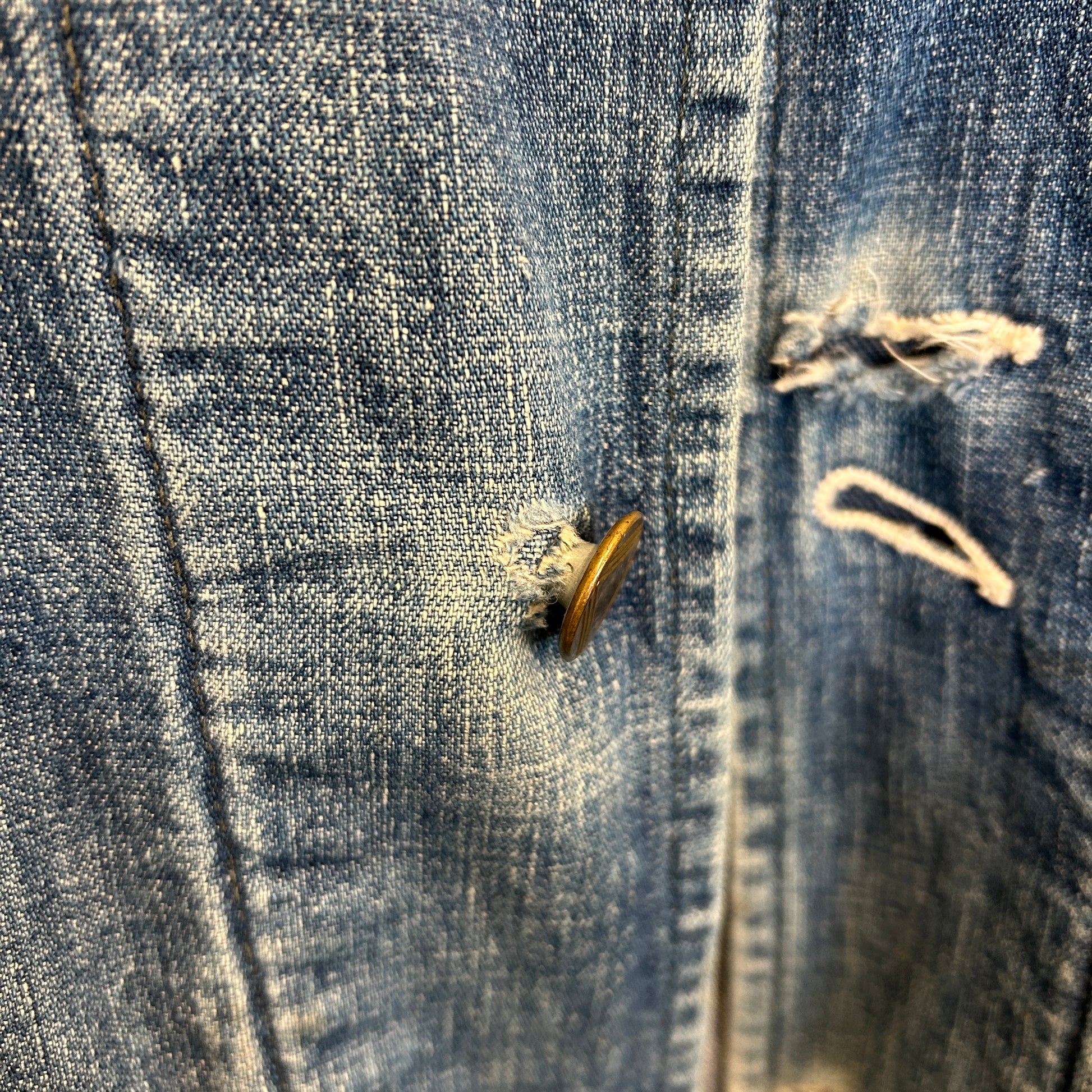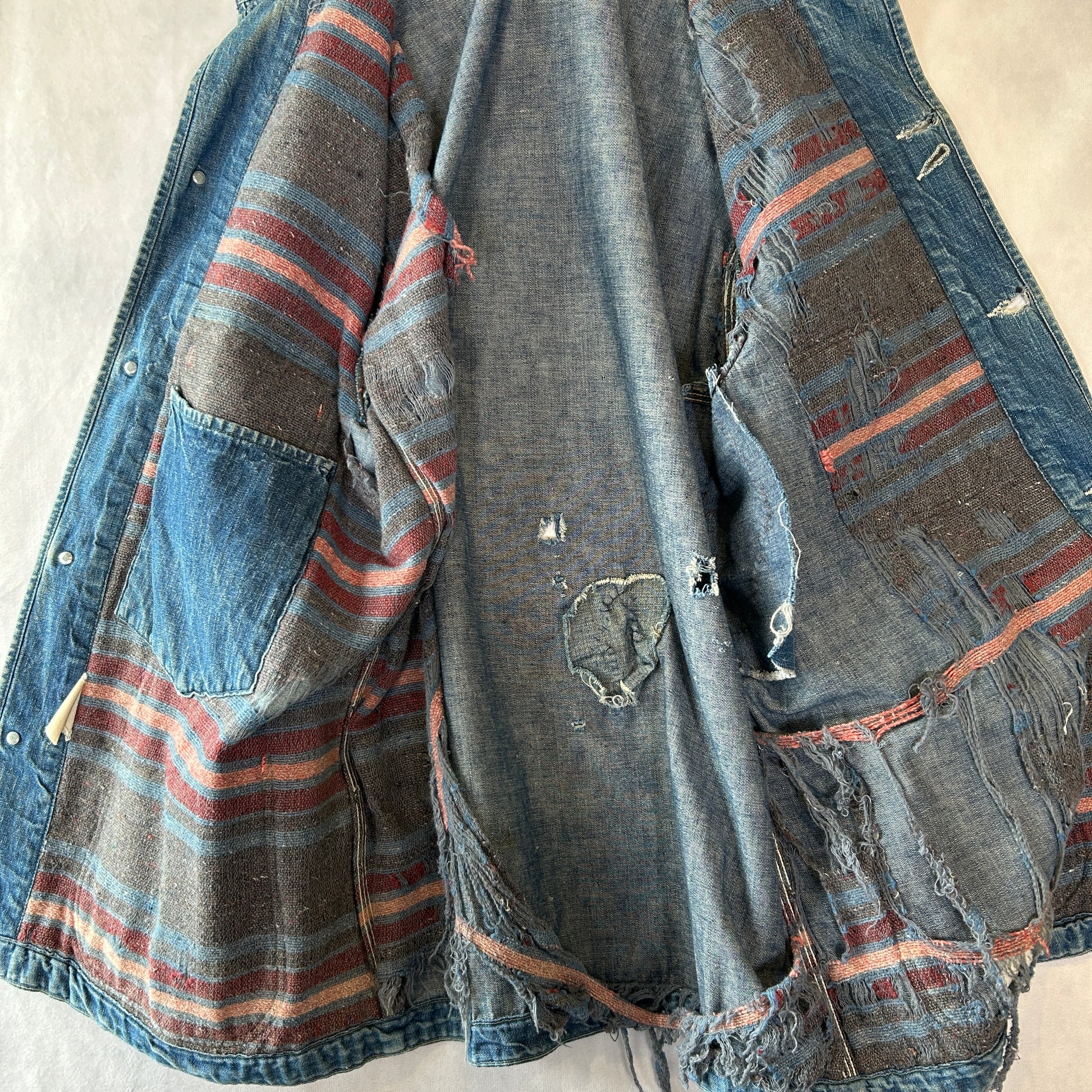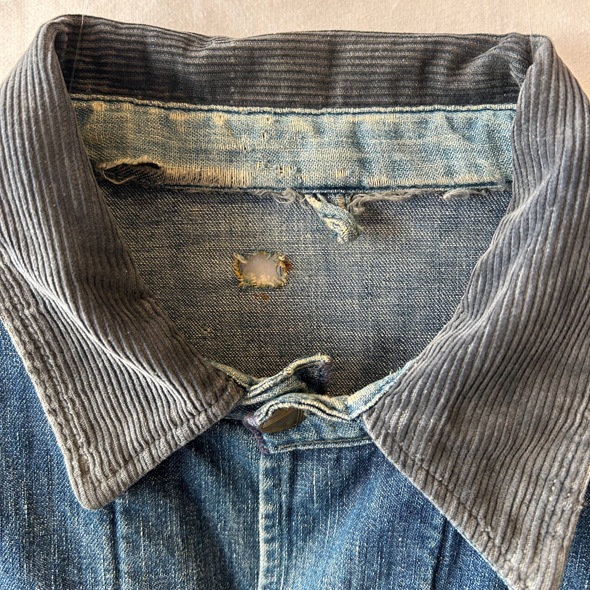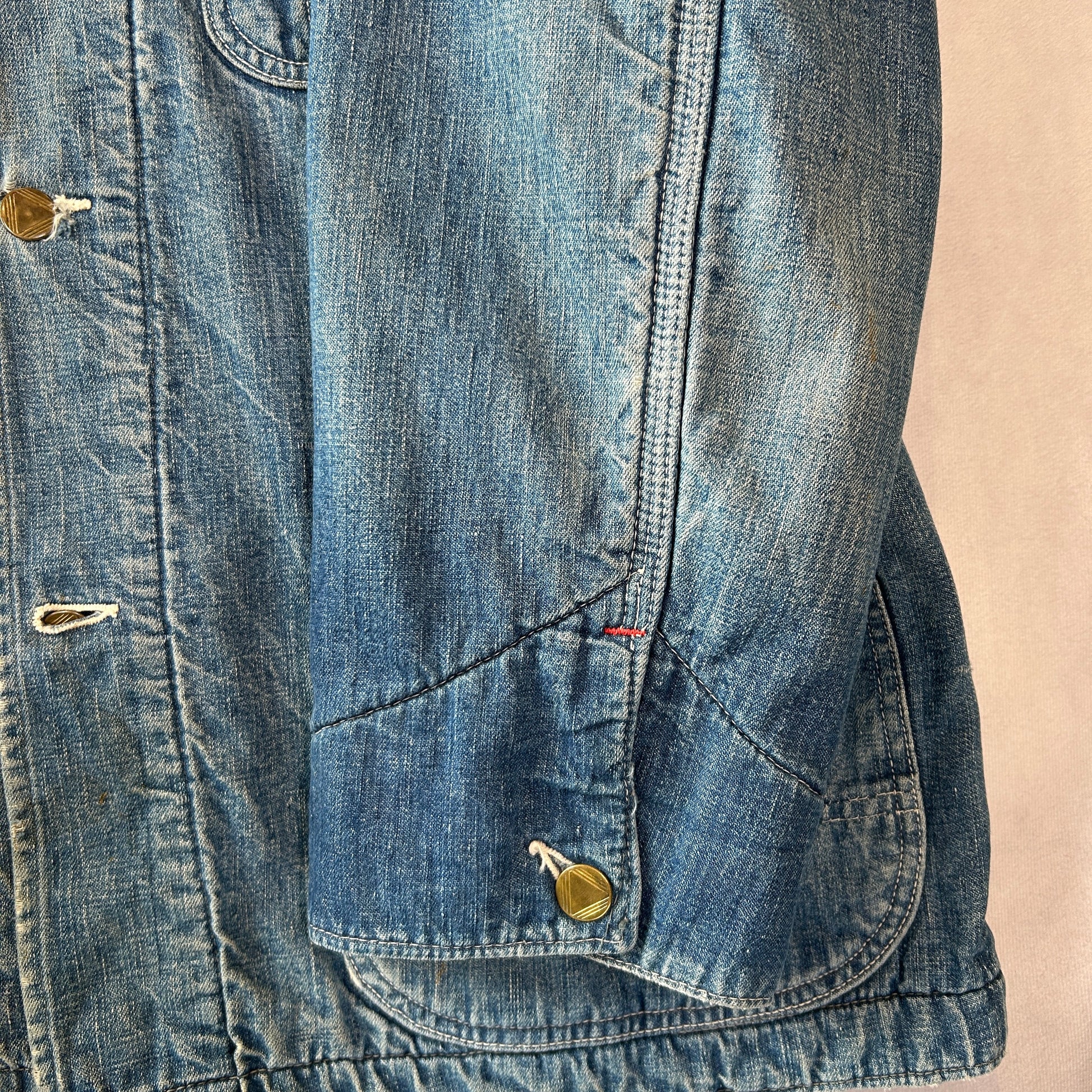 [状態特記]全体的に使用感あり、裏地ダメージ有り、襟内側に擦れ・ダメージ有り、右ポケット・胸ポケ下部にダメージ、左脇にリペアあり、フロントボタンホールにダメージ有り(上から2,3,4ボタン)、左ポケット底に穴開き有り、背面襟下・下部にダメージ有り、フロント第二ボタン部の生地にダメージ有り、その他画像参照ください。