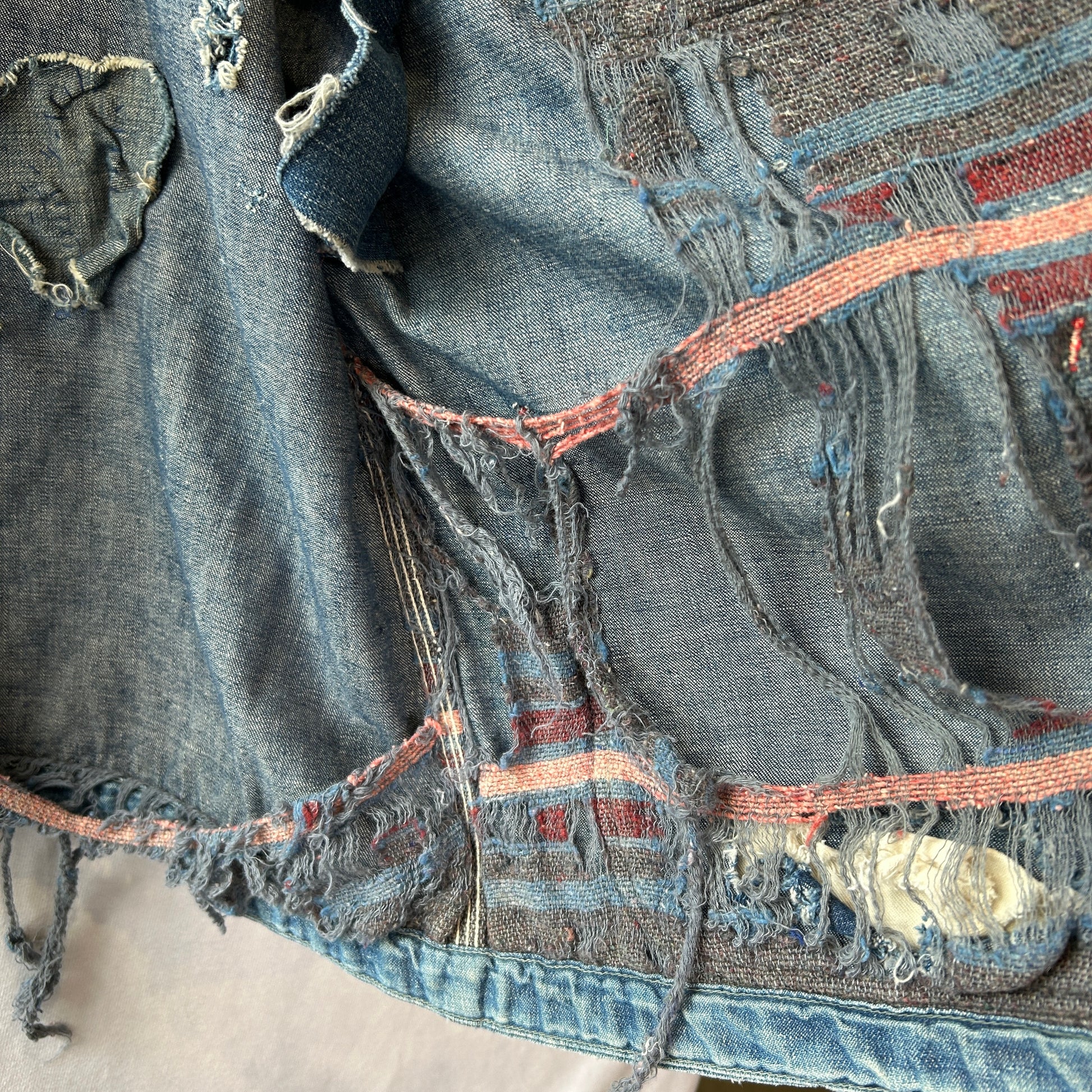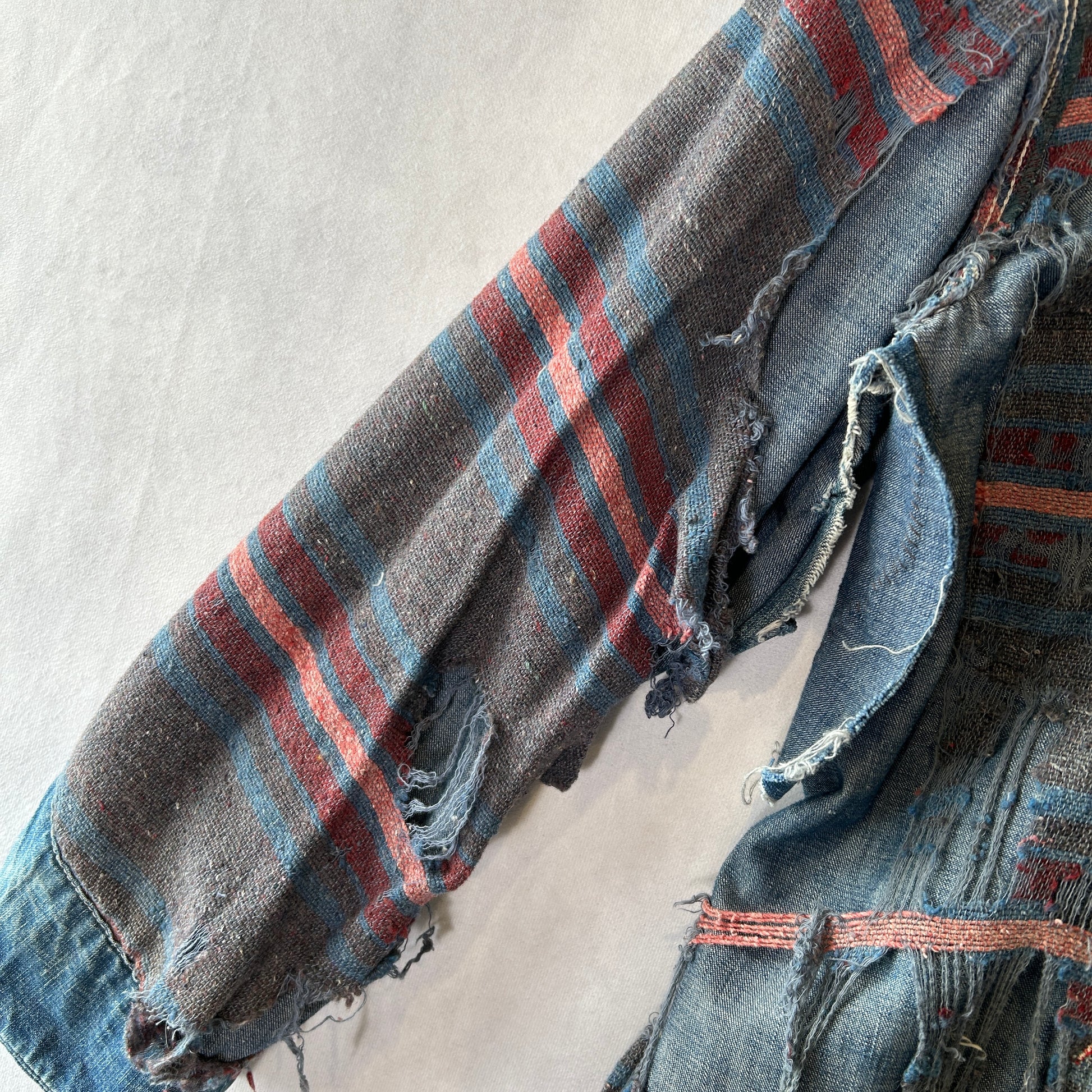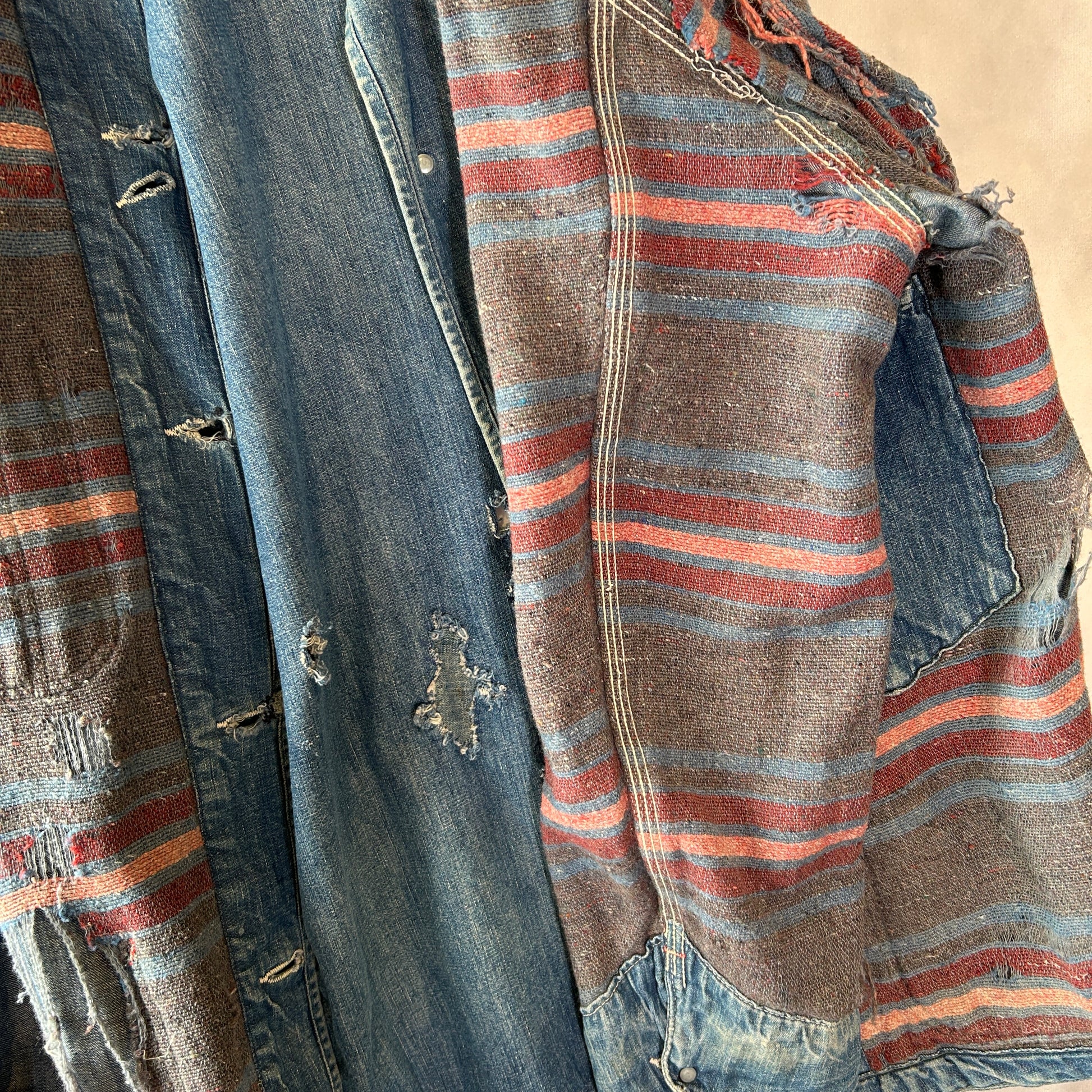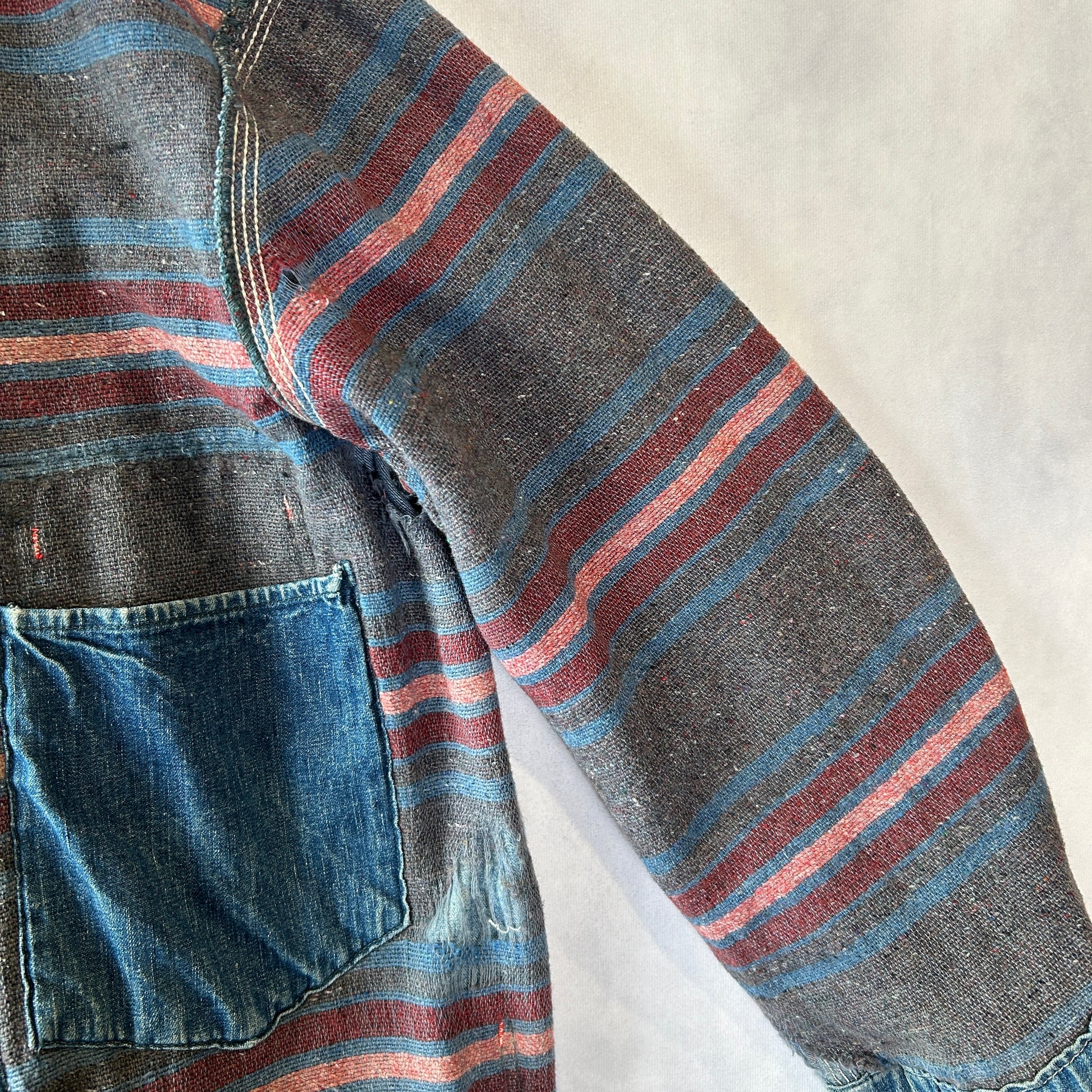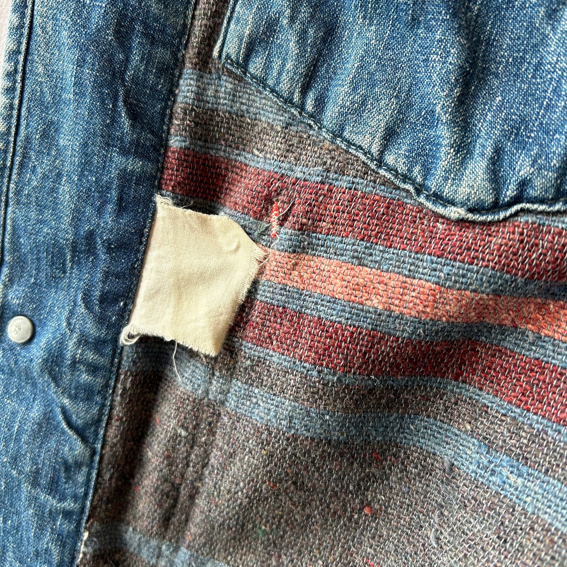 [状態特記]全体的に使用感あり、裏地ダメージ有り、襟内側に擦れ・ダメージ有り、右ポケット・胸ポケ下部にダメージ、左脇にリペアあり、フロントボタンホールにダメージ有り(上から2,3,4ボタン)、左ポケット底に穴開き有り、背面襟下・下部にダメージ有り、フロント第二ボタン部の生地にダメージ有り、その他画像参照ください。