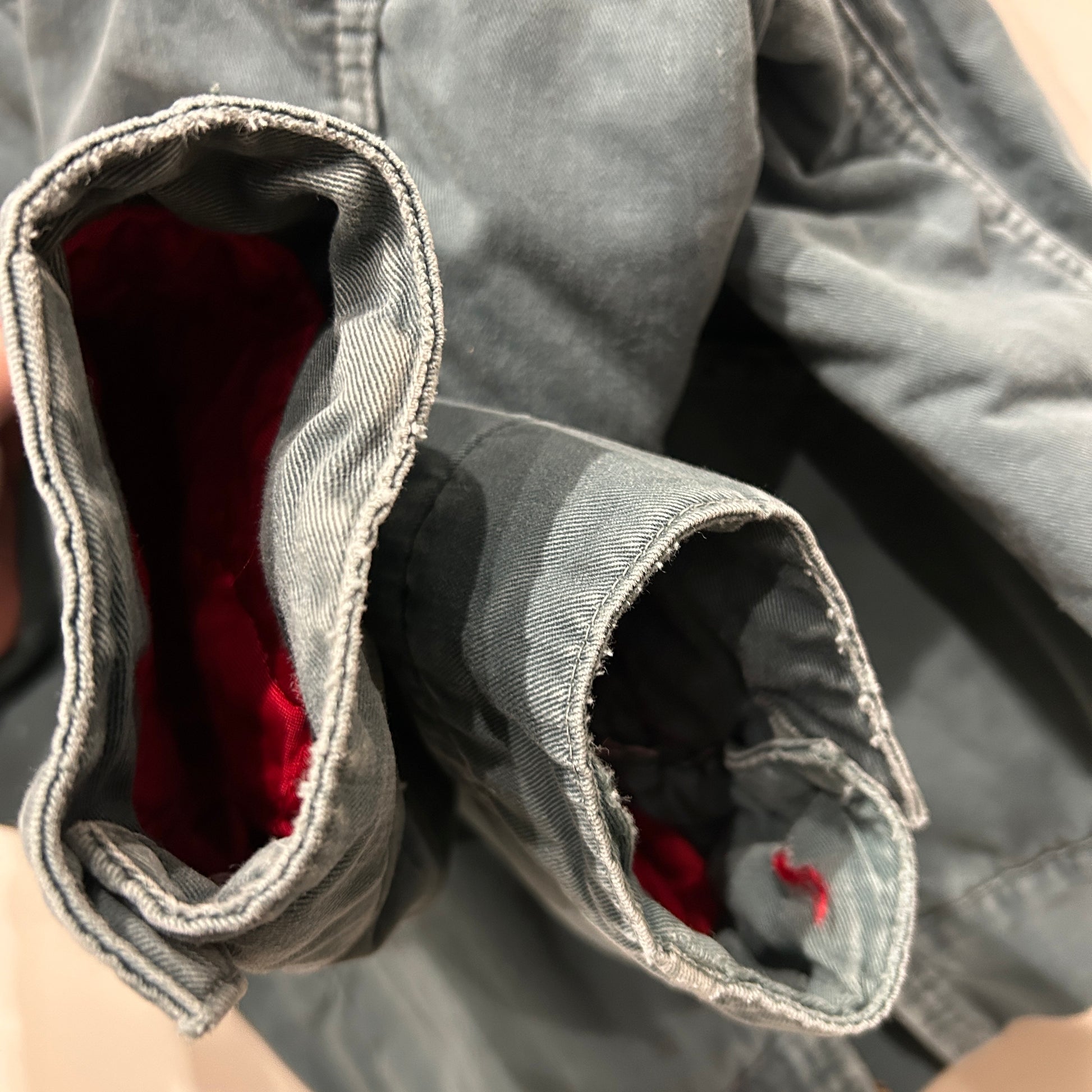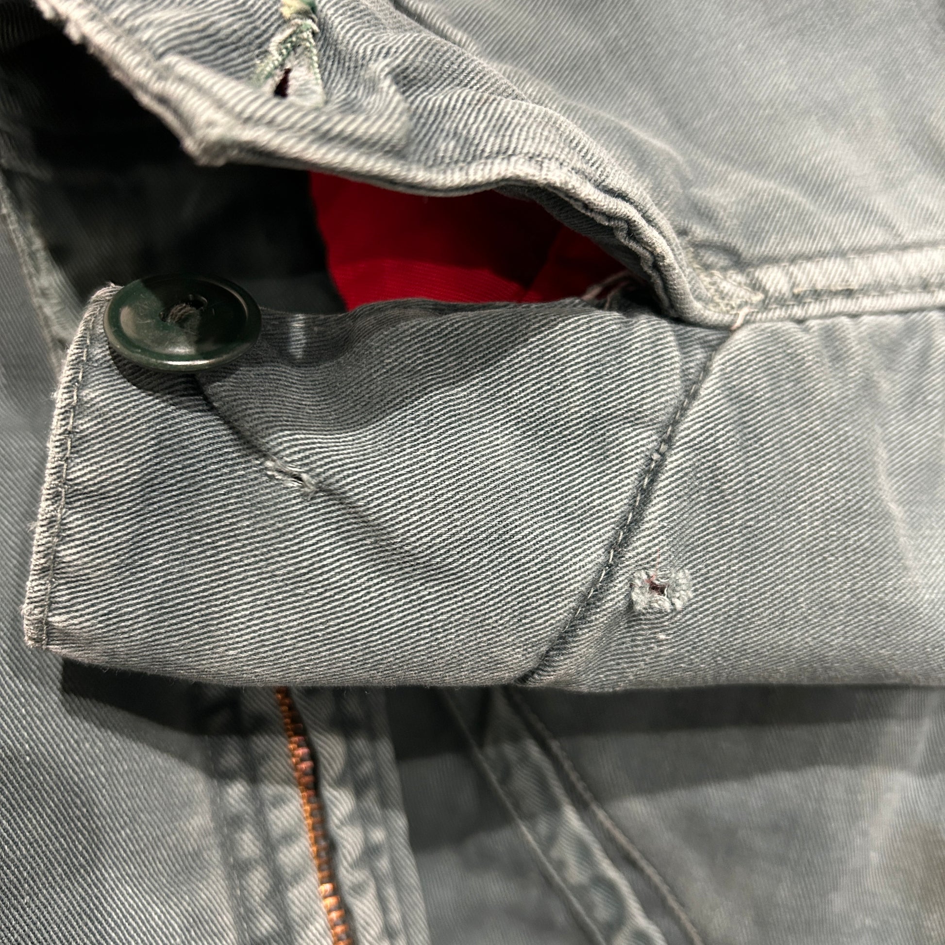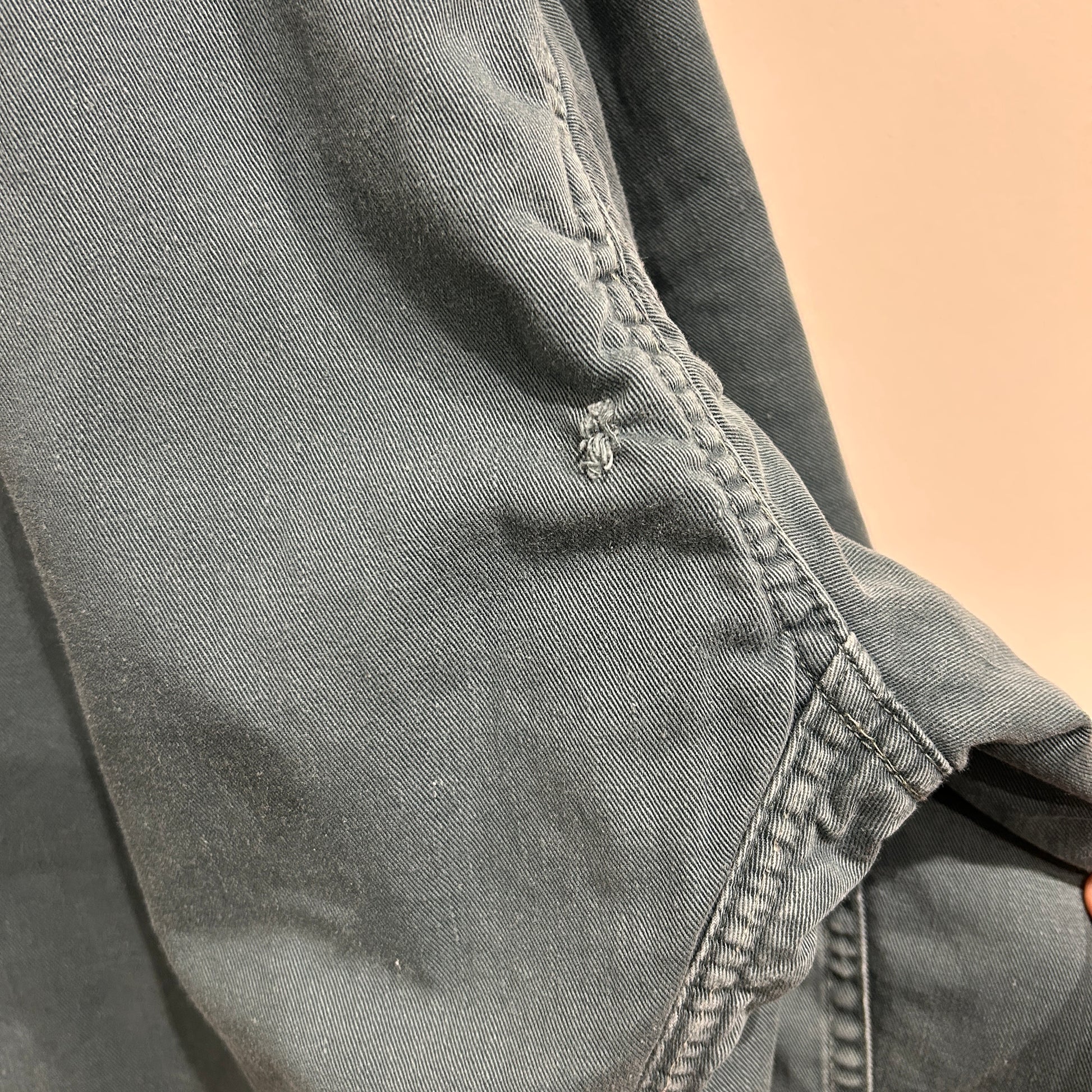 [状態特記]全体的に使用感・色褪せあり、背面の両脇付近に穴開きあり、袖に擦れや小さな穴開き有り、裏地キルティングのステッチ解れ有り