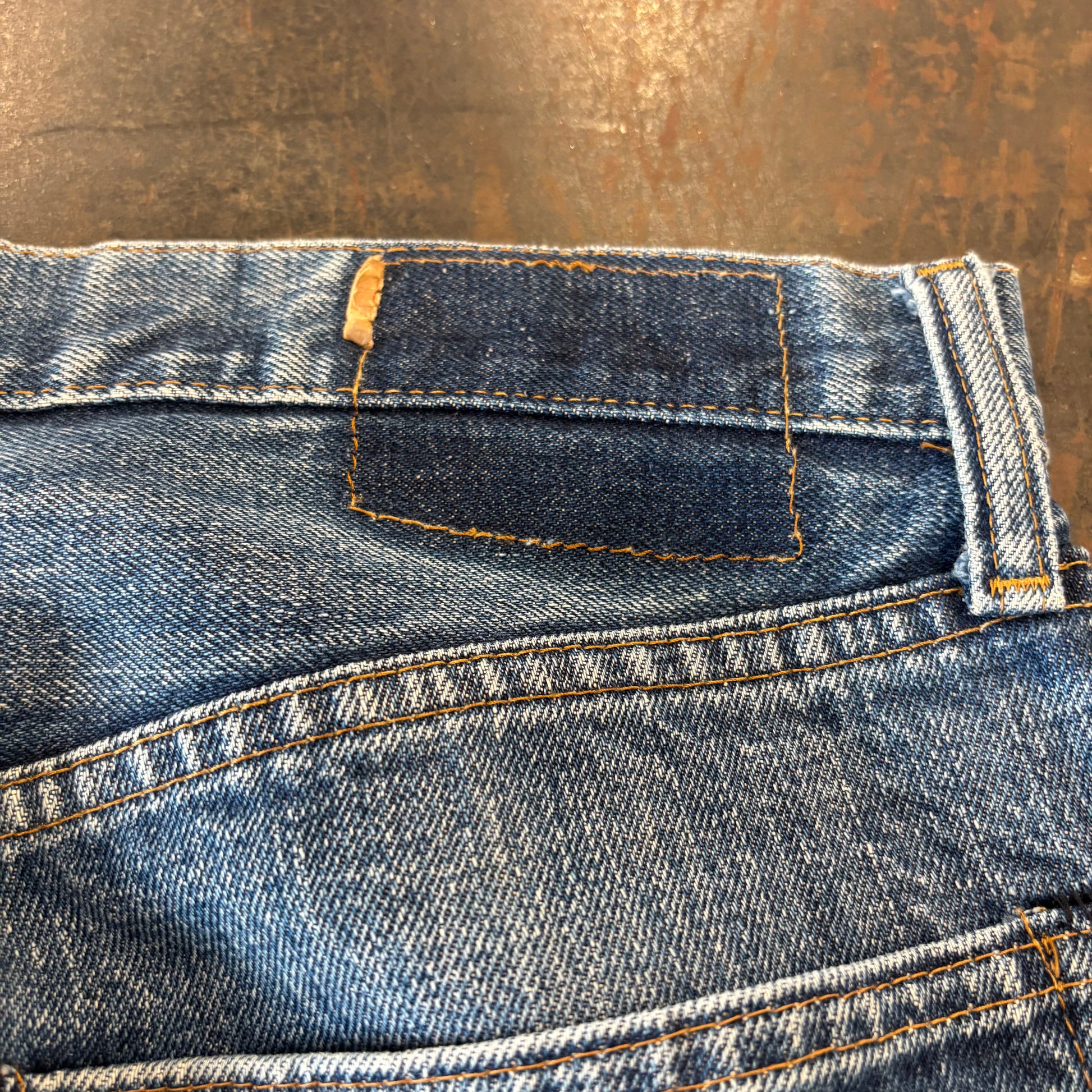 [状態特記]全体的に使用感あり、フロント右側裾部分に直しあり、バック右側ヒップ部分にダメージあり、バック右側太もも部分にダメージあり、バック右側膝裏部分にダメージあり、バック右側足下部に横に入ったダメージあり、バック左側裾付近に汚れ、ジップ部分のステッチにほつれあり、バック紙タグ欠損、スレーキ部分に汚れあり