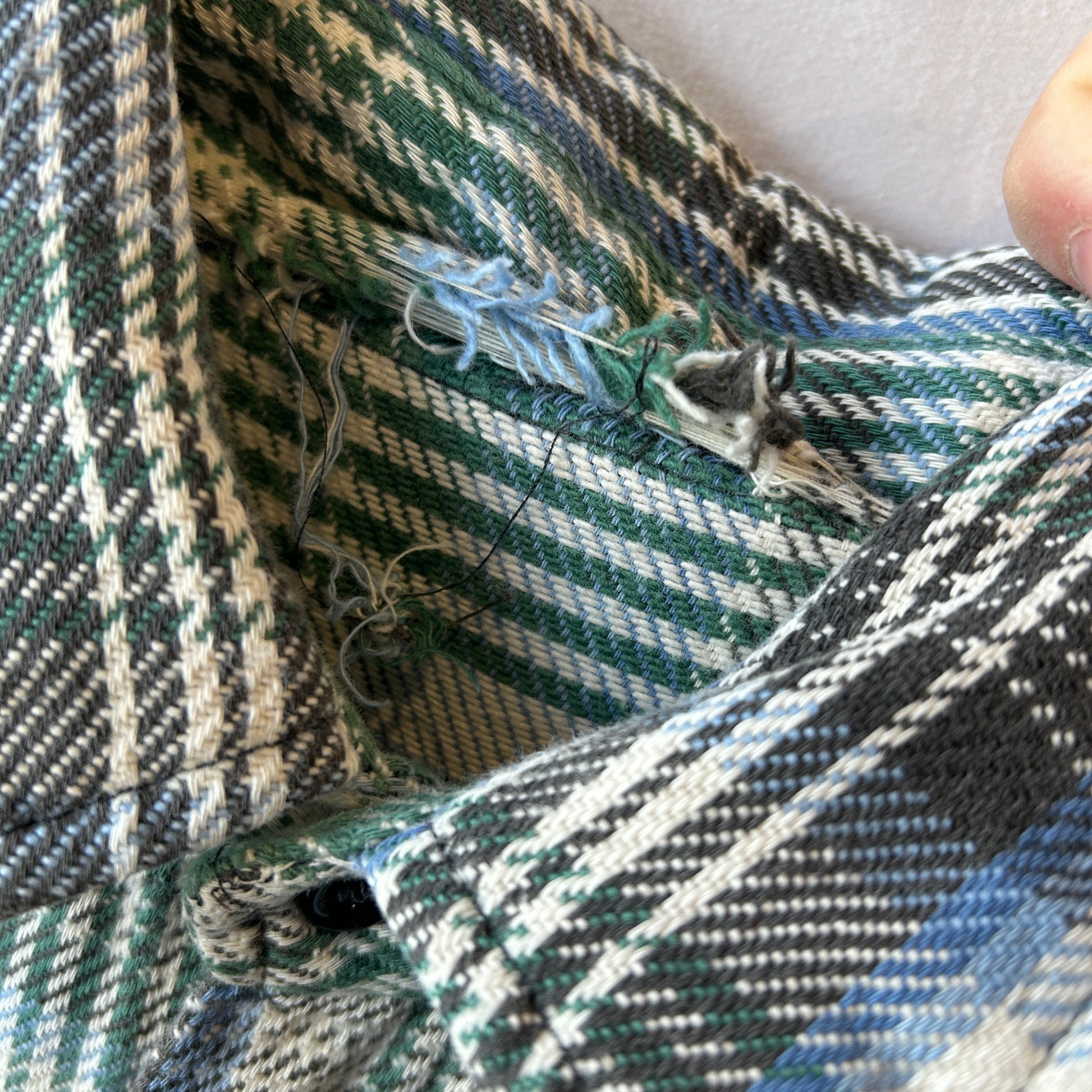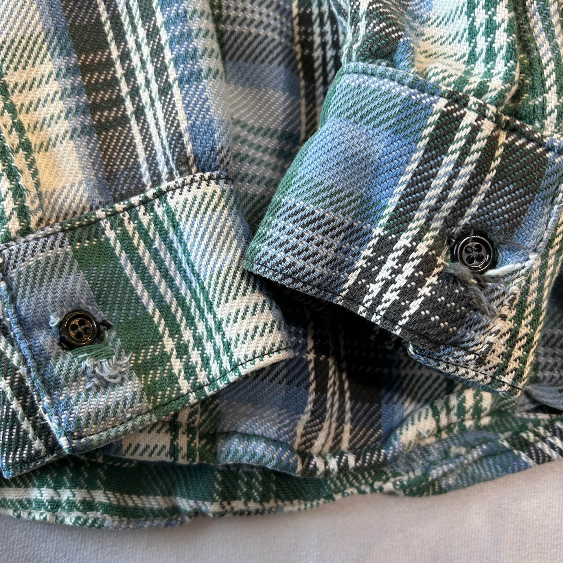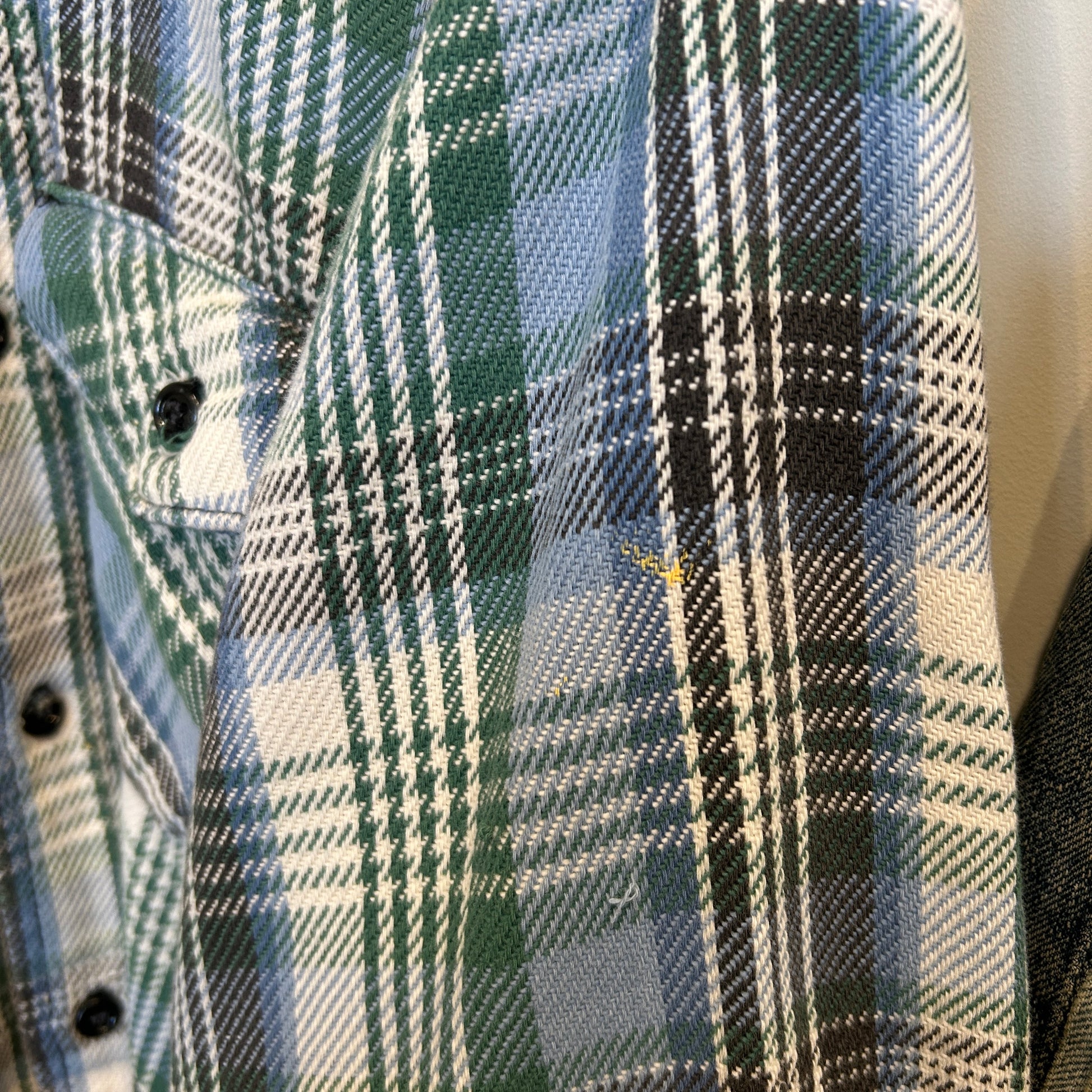 [状態特記]全体的に使用感あり、タグ欠損、上から4つ目のボタンに破損有り、前立てや袖口のボタンホールにほつれあり、襟元のタグ部分にダメージ有り、左袖にペンキ汚れ有り