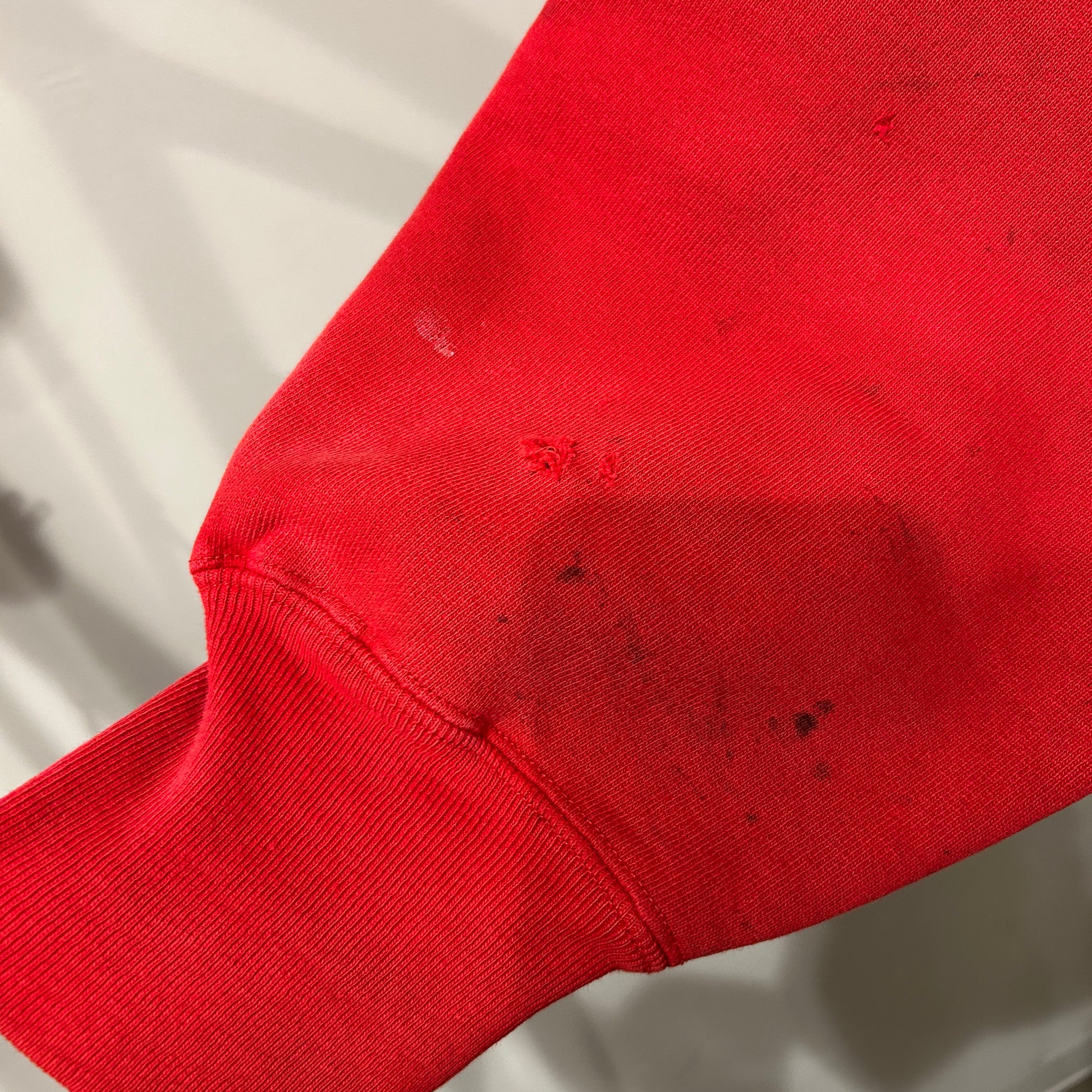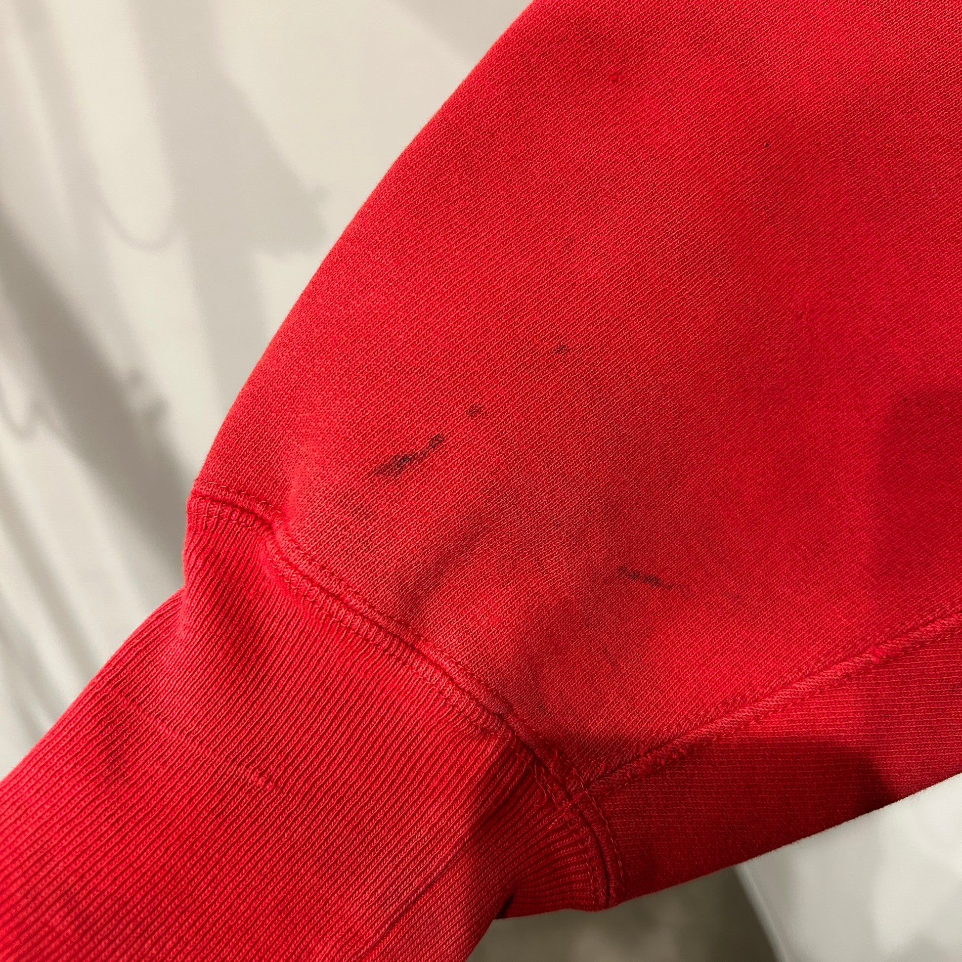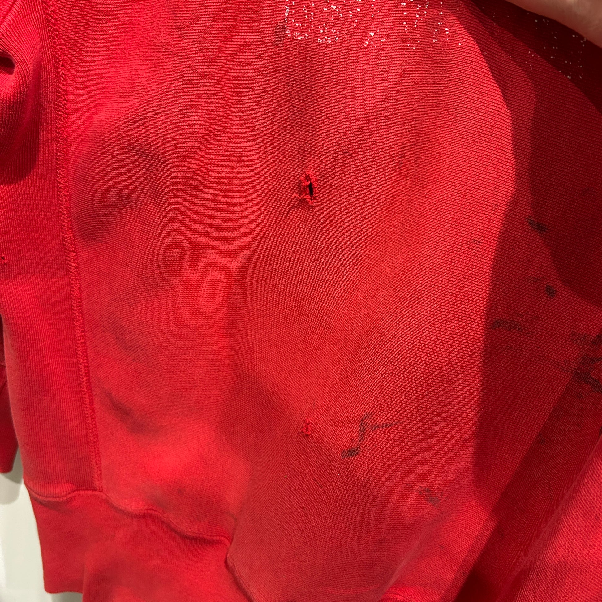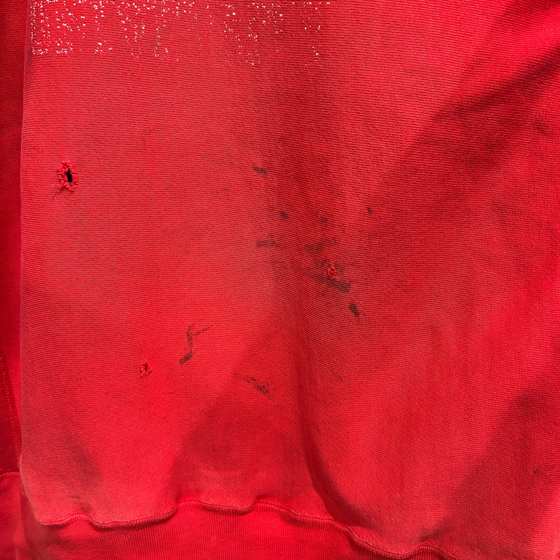 [状態特記]全体的に使用感あり、前面腹部にダメージ・汚れ有り、裾左側破れ有り、背面に汚れ・ダメージあり、袖部分にダメージや汚れ有り、首リブにダメージあり