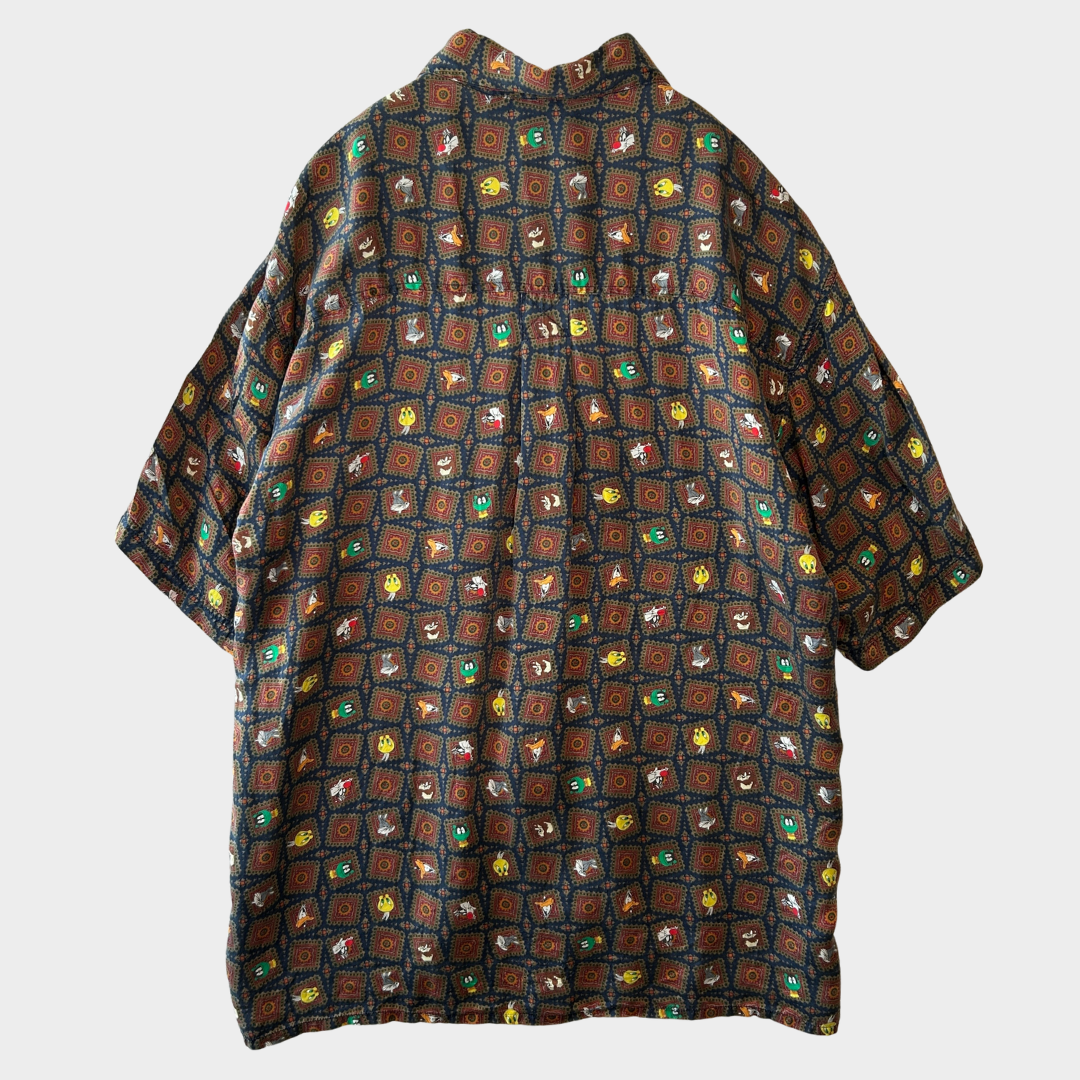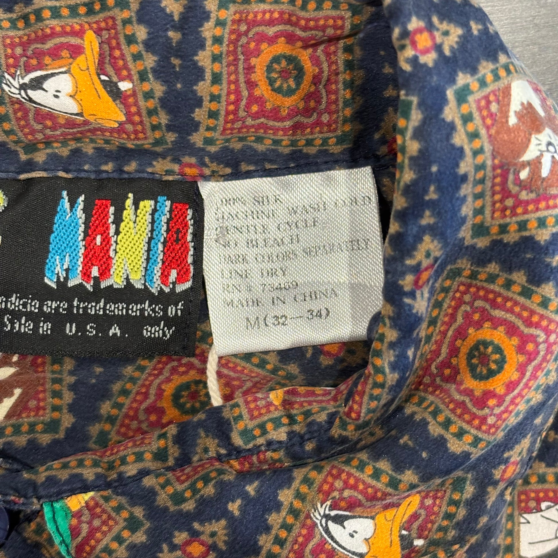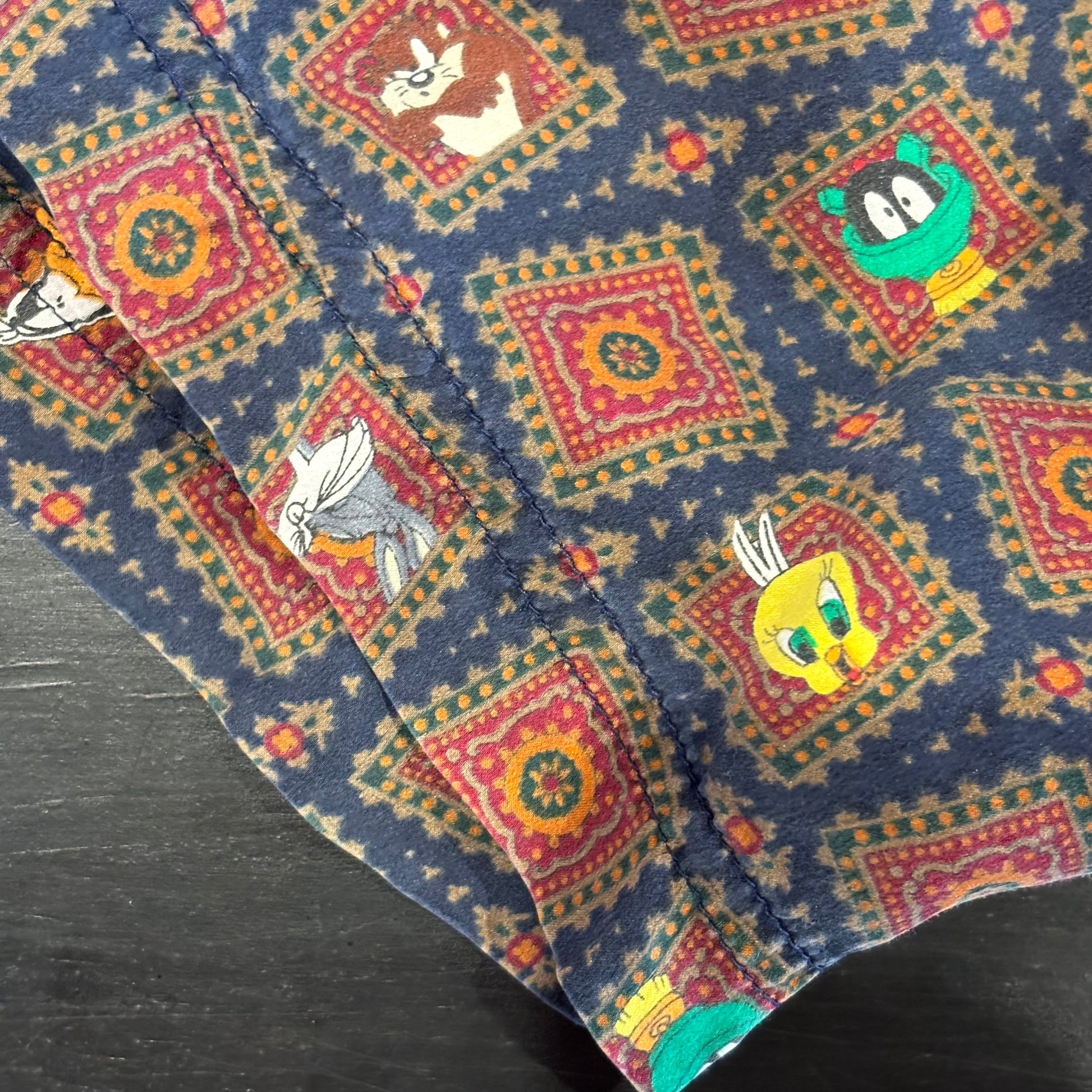 90's Loony Tunes WB 100%シルク キャラクター 半袖シャツ 紺赤 (M)/A3006S-SO