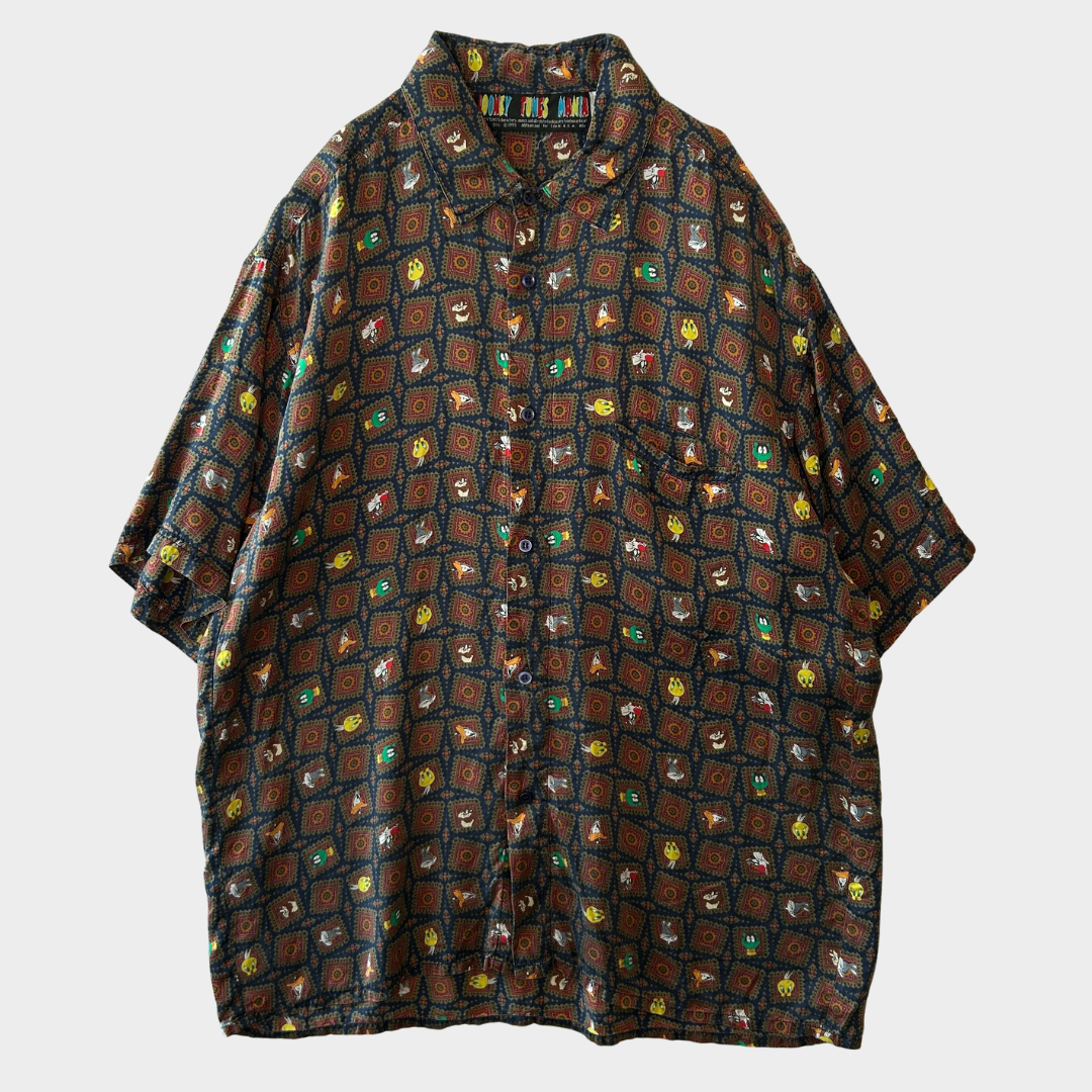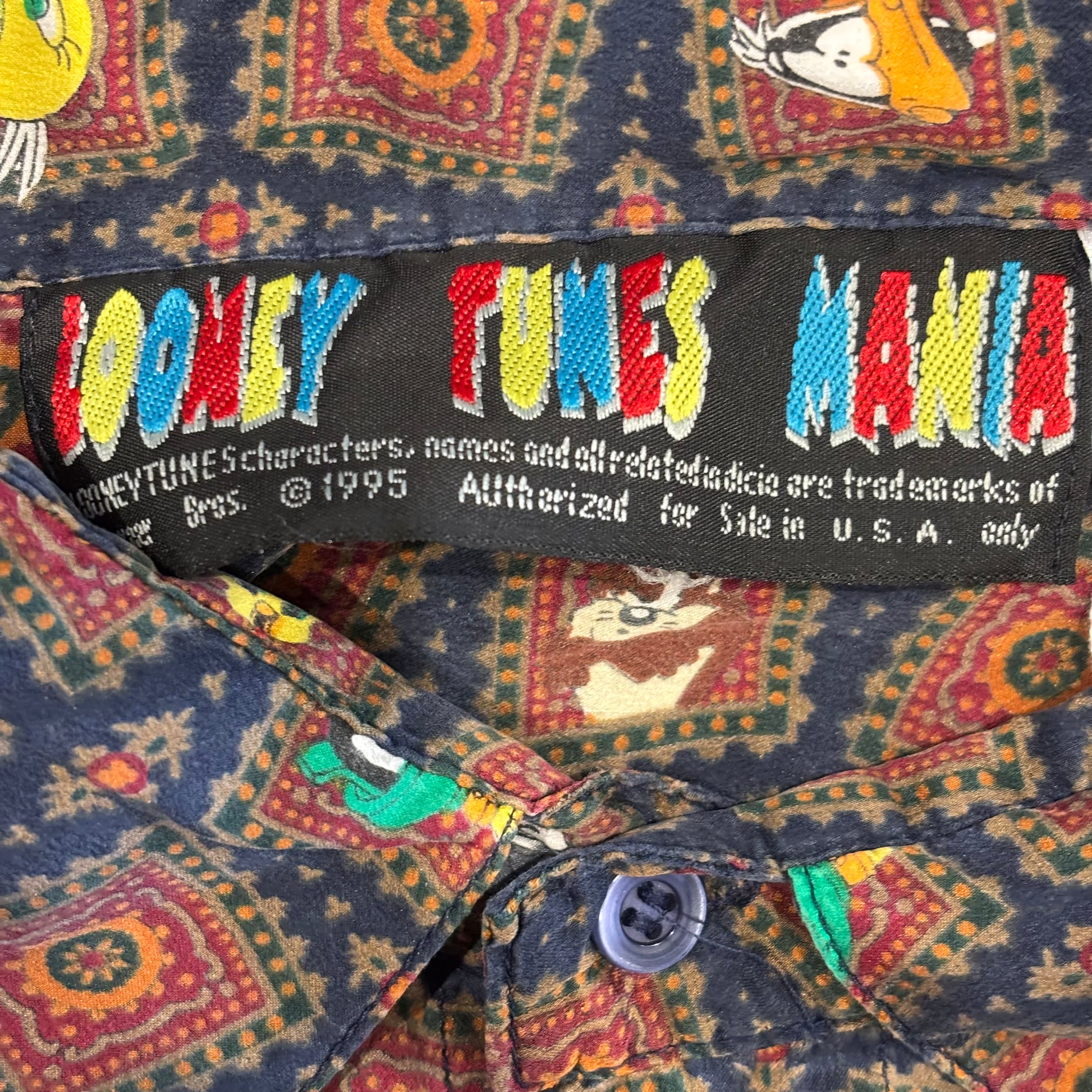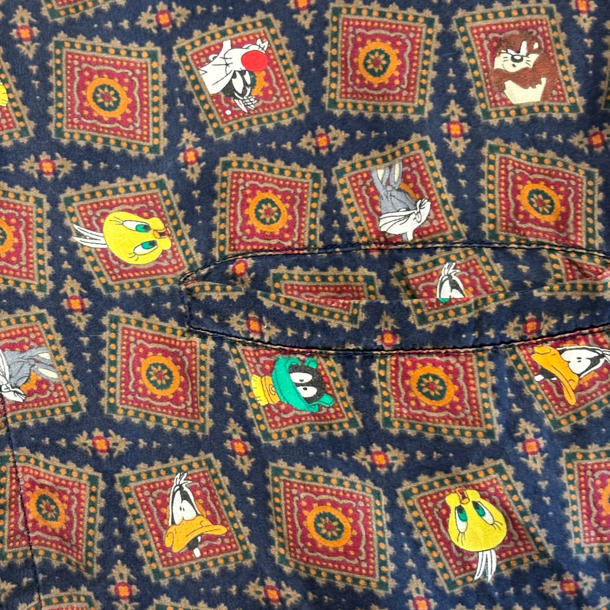 90's Loony Tunes WB 100%シルク キャラクター 半袖シャツ 紺赤 (M)/A3006S-SO